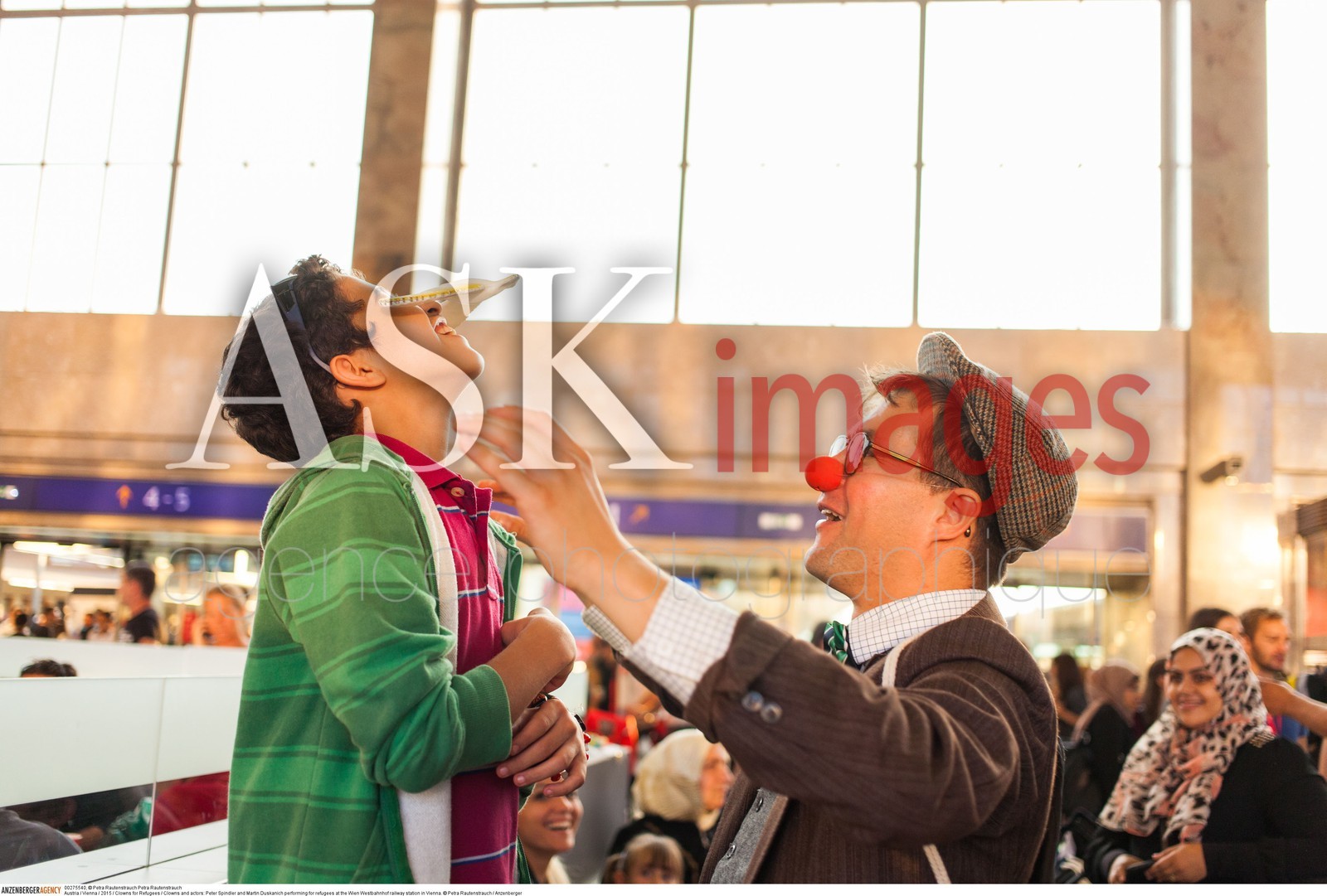 | Description | Austria / Vienna / 2015 / Clowns for Refugees / Clowns and actors: Peter Spindler and Martin Duskanich performing for refugees at the Wien Westbahnhof railway station in Vienna..© Petra Rautenstrauch / Anzenberger/ASK Images |