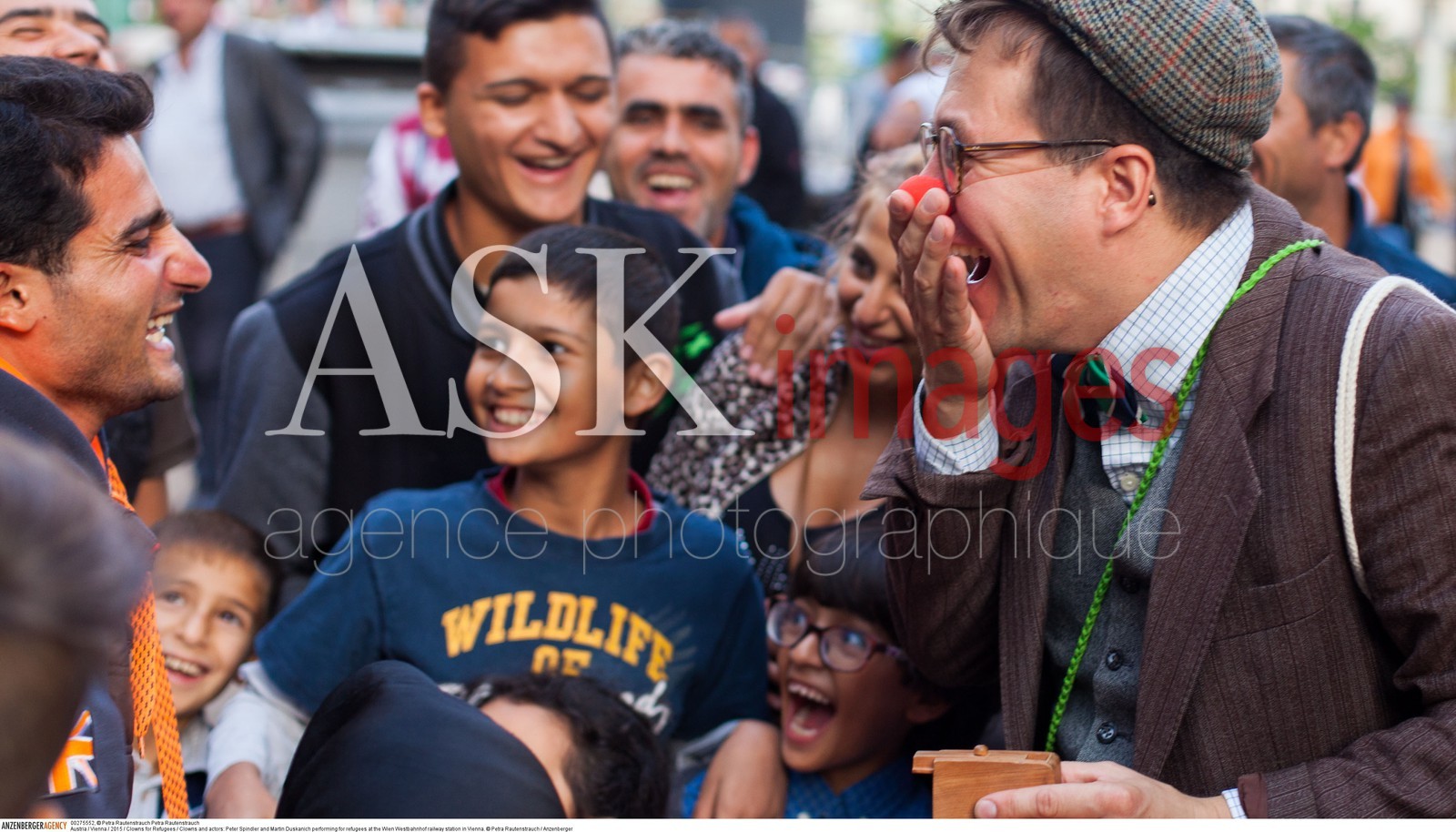 | Description | Austria / Vienna / 2015 / Clowns for Refugees / Clowns and actors: Peter Spindler and Martin Duskanich performing for refugees at the Wien Westbahnhof railway station in Vienna..© Petra Rautenstrauch / Anzenberger/ASK Images |