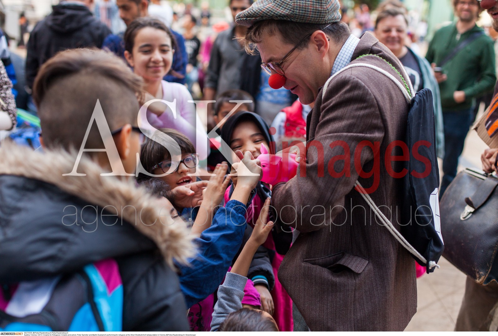 | Description | Austria / Vienna / 2015 / Clowns for Refugees / Clowns and actors: Peter Spindler and Martin Duskanich performing for refugees at the Wien Westbahnhof railway station in Vienna..© Petra Rautenstrauch / Anzenberger/ASK Images |
