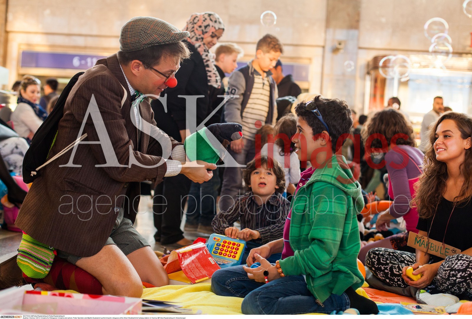 | Description | Austria / Vienna / 2015 / Clowns for Refugees / Clowns and actors: Peter Spindler and Martin Duskanich performing for refugees at the Wien Westbahnhof railway station in Vienna..© Petra Rautenstrauch / Anzenberger/ASK Images |