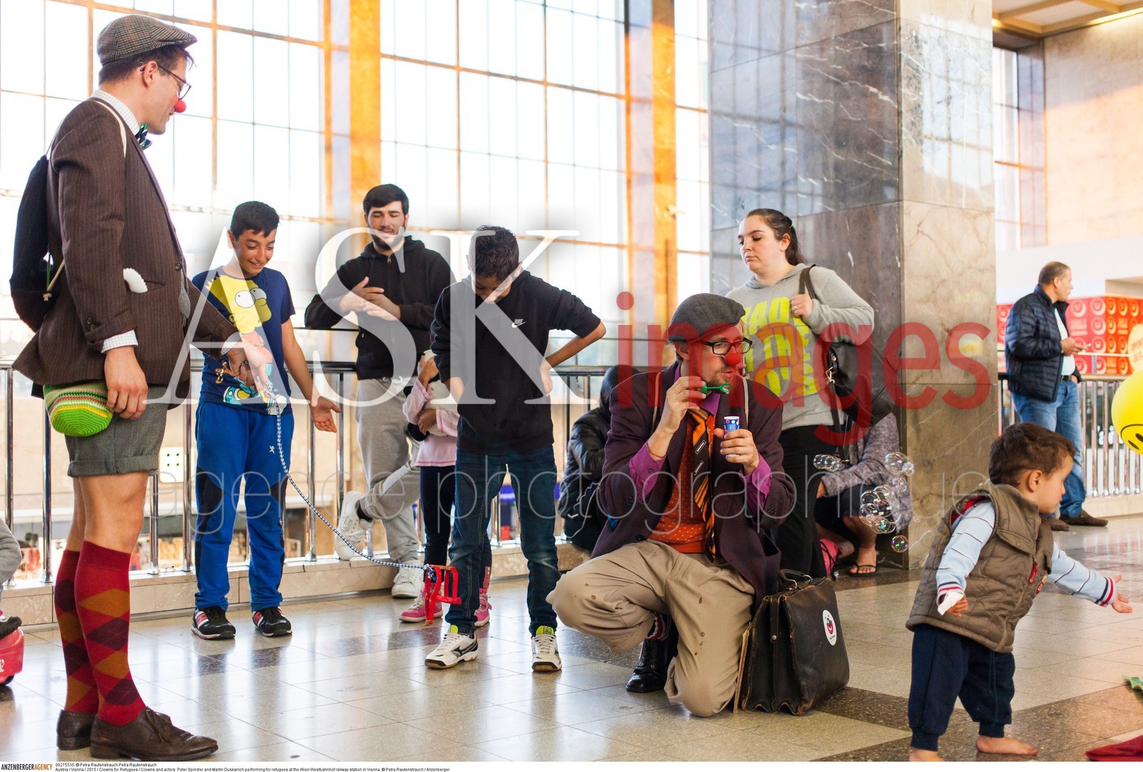 | Description | Austria / Vienna / 2015 / Clowns for Refugees / Clowns and actors: Peter Spindler and Martin Duskanich performing for refugees at the Wien Westbahnhof railway station in Vienna..© Petra Rautenstrauch / Anzenberger/ASK Images |