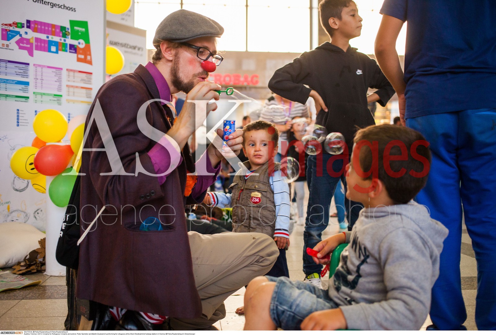 | Description | Austria / Vienna / 2015 / Clowns for Refugees / Clowns and actors: Peter Spindler and Martin Duskanich performing for refugees at the Wien Westbahnhof railway station in Vienna..© Petra Rautenstrauch / Anzenberger/ASK Images |
