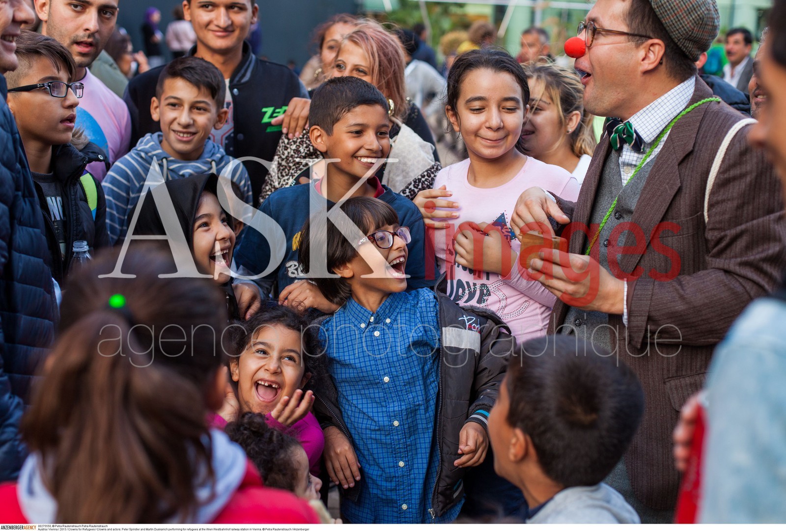 | Description | Austria / Vienna / 2015 / Clowns for Refugees / Clowns and actors: Peter Spindler and Martin Duskanich performing for refugees at the Wien Westbahnhof railway station in Vienna..© Petra Rautenstrauch / Anzenberger/ASK Images |