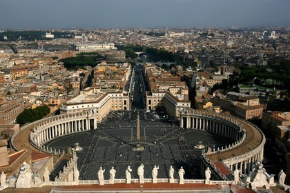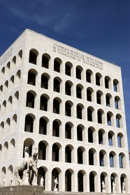 Rome, EUR district: the Colisee Square (1938) draws its great white mass punctuated by six storeys of arches above the Tiber. Italy, Rome