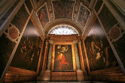Rome, Paintings by Caravaggio at the Church of St Louis of the French, Triptych of St Matthew. Italy, Rome