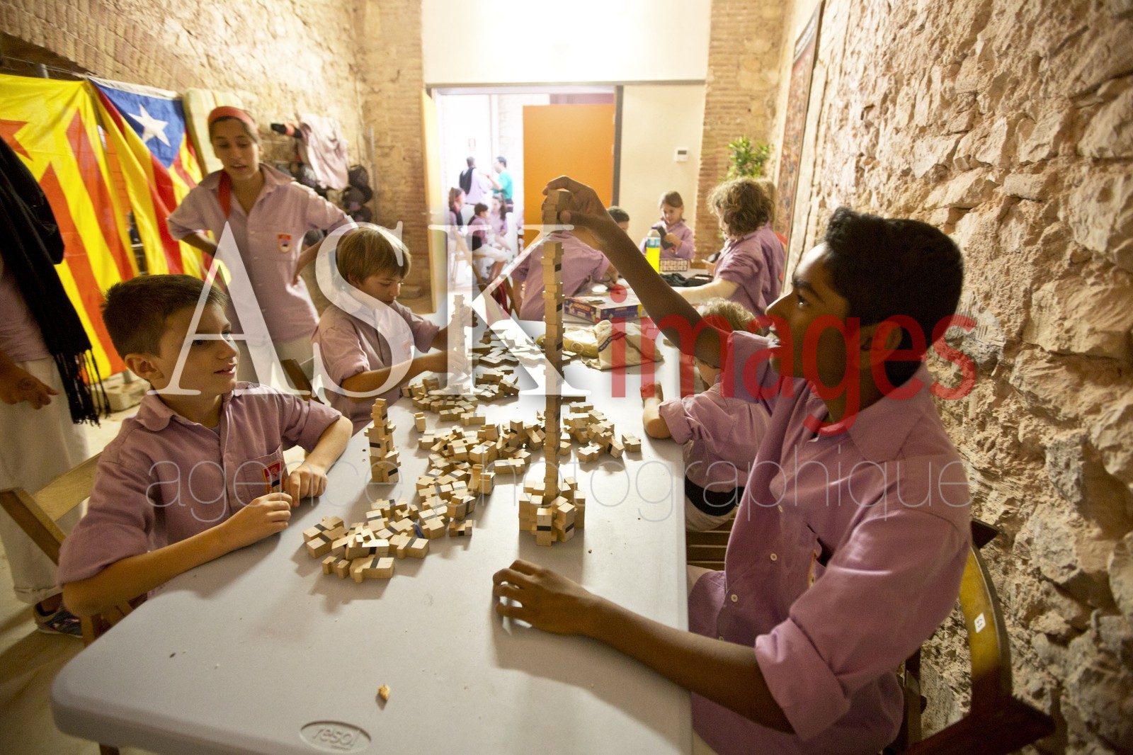| Description | Spain, Tarragona, the XXV contest of Castells in Tarragona, Catalonia, is held in the arena Tarraco placa, children are resting before contest |