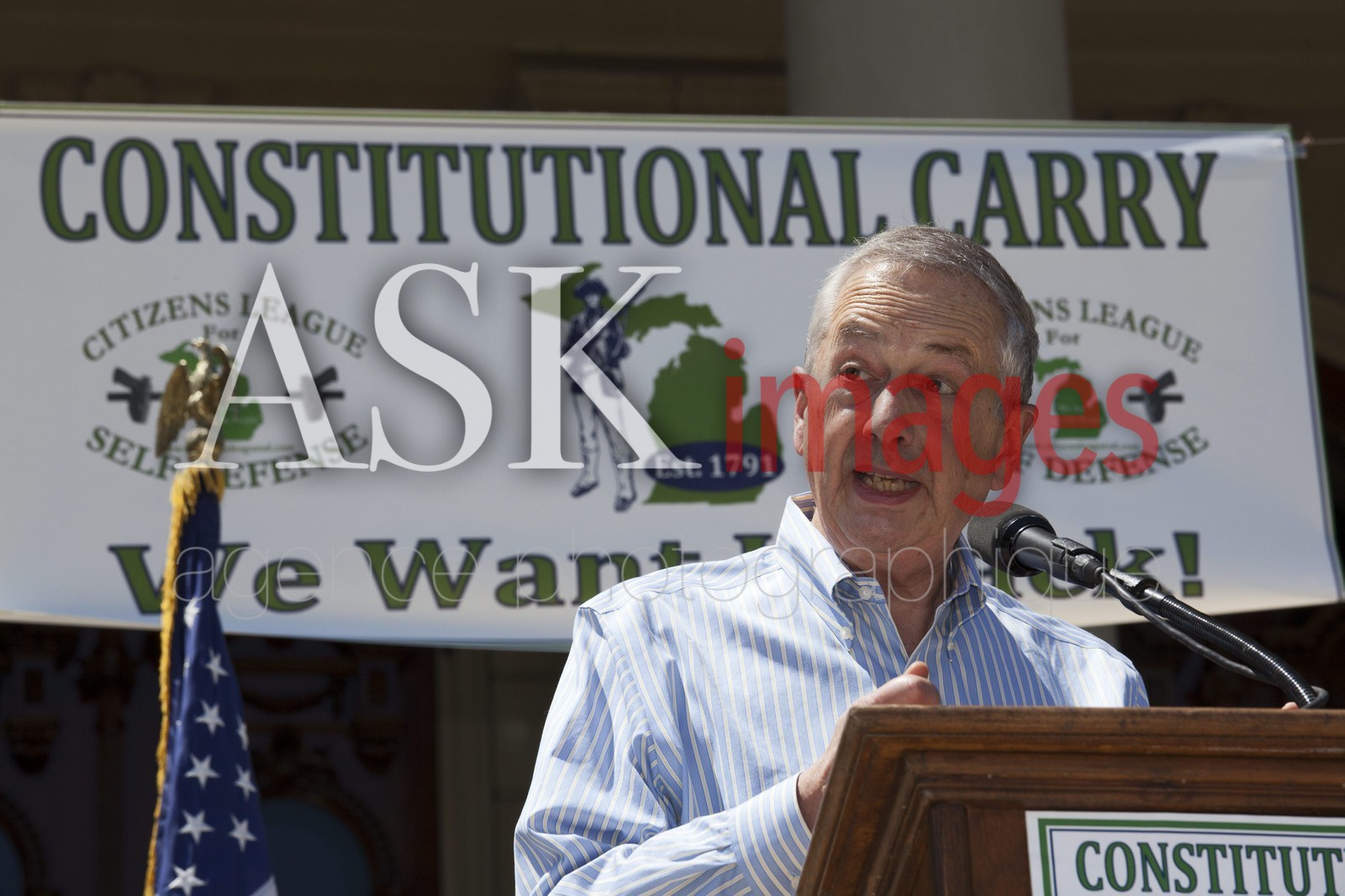 | Description | Lansing, Michigan - Larry Pratt, executive director of Gun Owners of America, speaks at a rally at the state capitol opposing a bill to repeal Michigan's "stand your ground" law. Michigan's law is similar to the Florida legislation publicized by the Trayvon Martin shooting; it allows gun owners to shoot to kill if they feel endangered, rather than first trying to retreat..© Jim West / The Image Works |