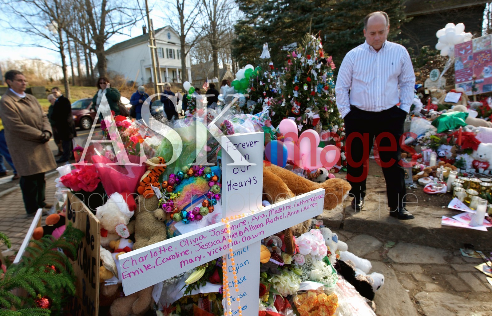 | Description | Newtown, CT: December 19, 2012. A cross bears the names of the victims of the Sandy Hook Elementary School massacre as people pay tribute at a makeshift memorial on December 19, 2012 in Newtown, Connecticut. Last week the gunman, Adam Lanza, opened fired inside the school, killing 20 students and 6 adults, before turning the gun on himself. It is believed that Lanza suffered from mental illness and used his mother's weapons to carry out the shootings.. |