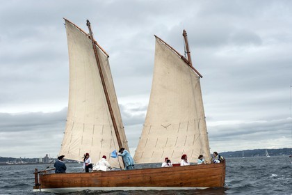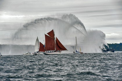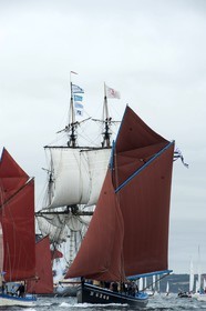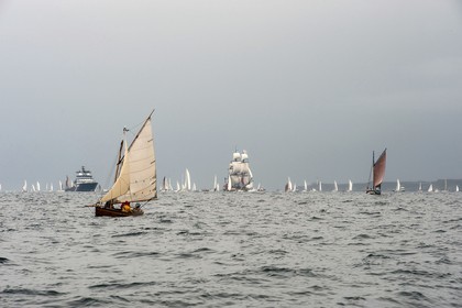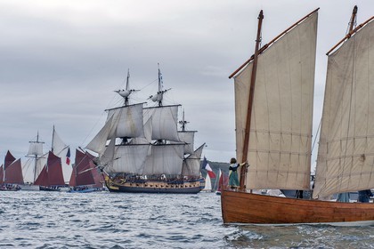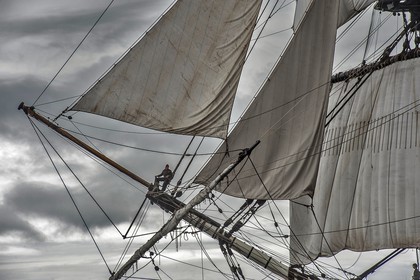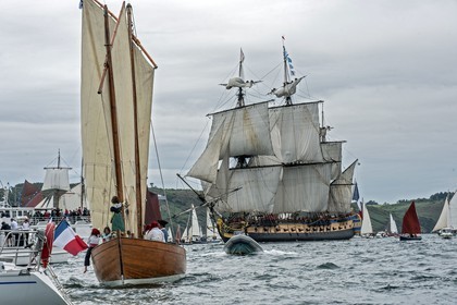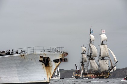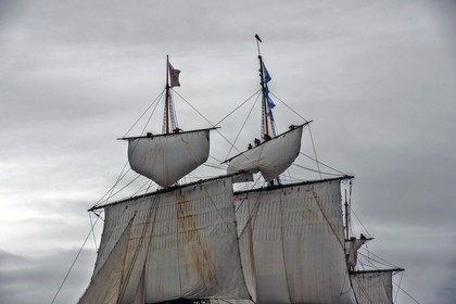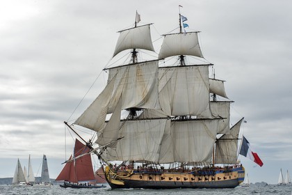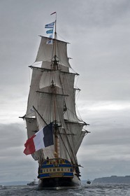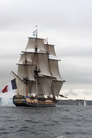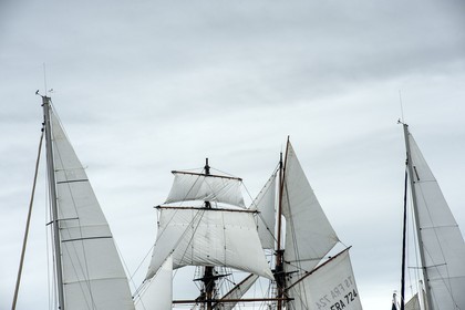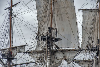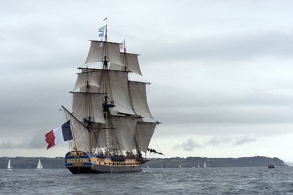 The three mats the Hermione, exact replica of the Lafayette 's boat in Goulet de Brest, Bretagne, France, August 2015 Fregate l'Hermione, Goulet de Brest Aout 2015