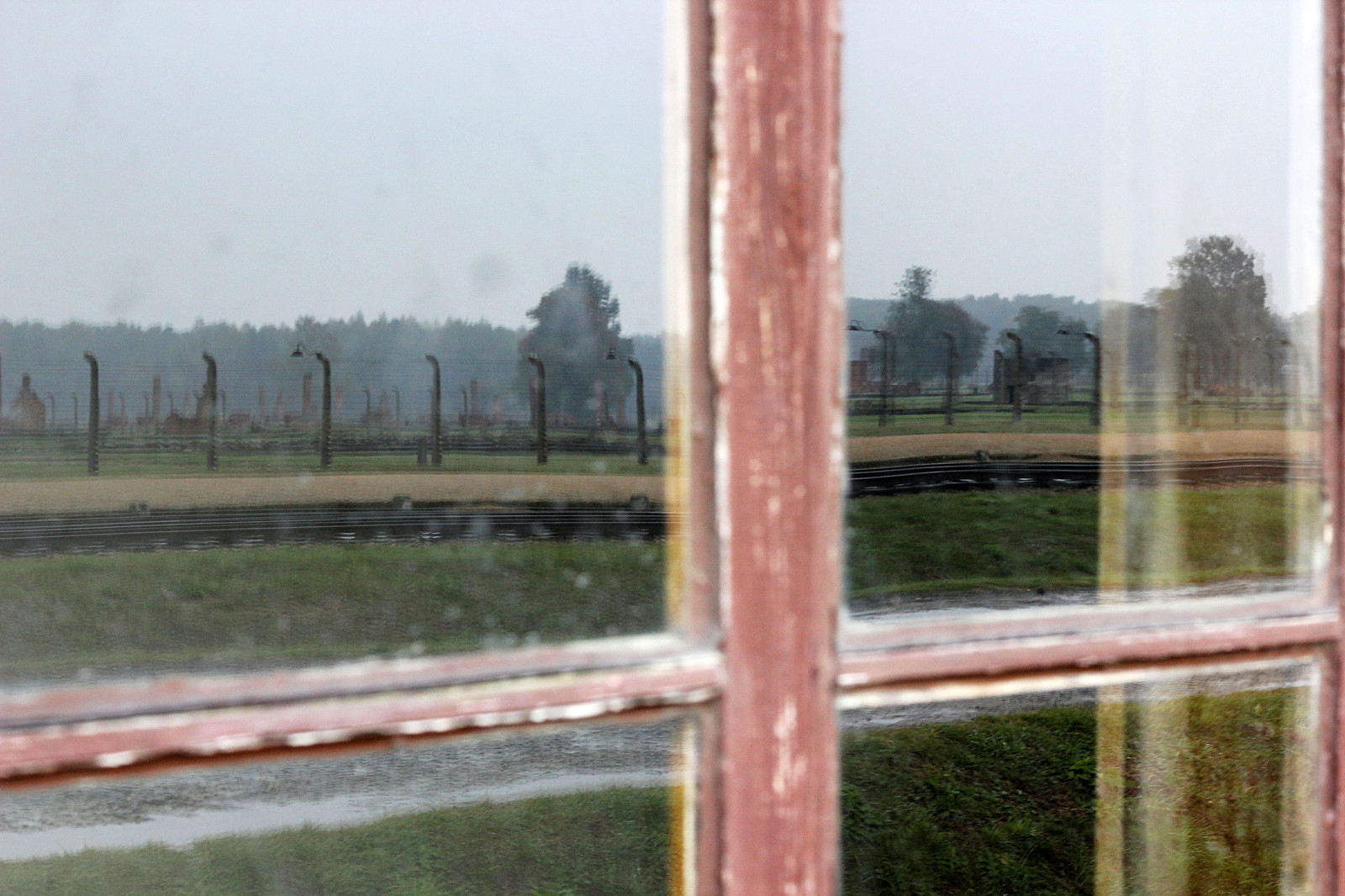 DescriptionEurope, Pologne, Voivodie petite pologne, Oswiecim, Auschwitz Birkenau, a travers la fenetre du baraquement ou le trie se faisait a l arrivee des prisonniers, l on peut observer dans le reflet les vestiges du camp, construit a partir de 1940 par heinrich himmler, plus de 1.1 millions d enfants, de femmes et d hommes meurent dont 900 000 directement a la sortie du train, aujourd hui monument historique et culturel qui contribu au devoir de memoire inscrit au patrimoine mondial de l unesco