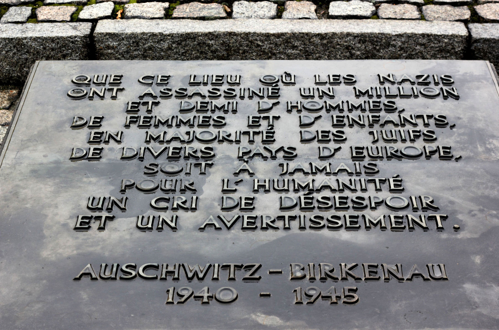 DescriptionEurope, Pologne, Voivodie de petite pologne, Oswiecim, Auschwitz Birkenau, plaque commemorative au fond du camp, ce texte est inscrit sur 22 dalles fixÈes sur le sol d un monument, toutes traduites dans des langues differentes, construit a partir de 1940 par heinrich himmler , plus de 1.1 millions d enfants, de femmes et d hommes meurent dont 900 000 directement a la sortie du train, aujourd hui monument historique et culturel qui contribu au devoir de memoire inscrit au patrimoine mondial de l unesco.
