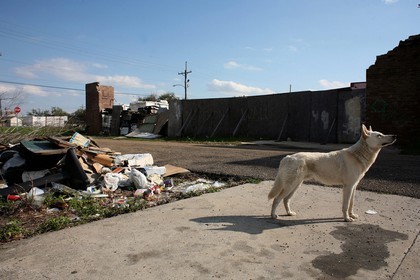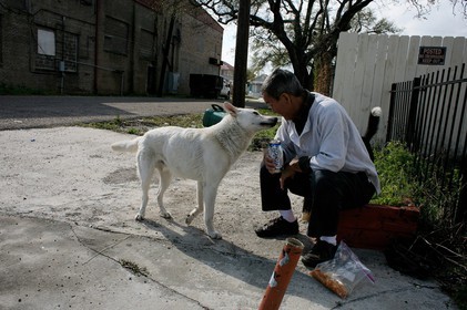 • White Fang, a stray dog that has some coyote in him, has been adopted by Dale, a man recently living under the Interstate until a charity organization found them both a home in the lower ninth ward. ©Andrew Lichtenstein / The Image Works