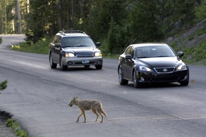 • Wyoming: Coyote crossing the road with traffic in Yellowstone National Park. ©David R. Frazier / The Image Works