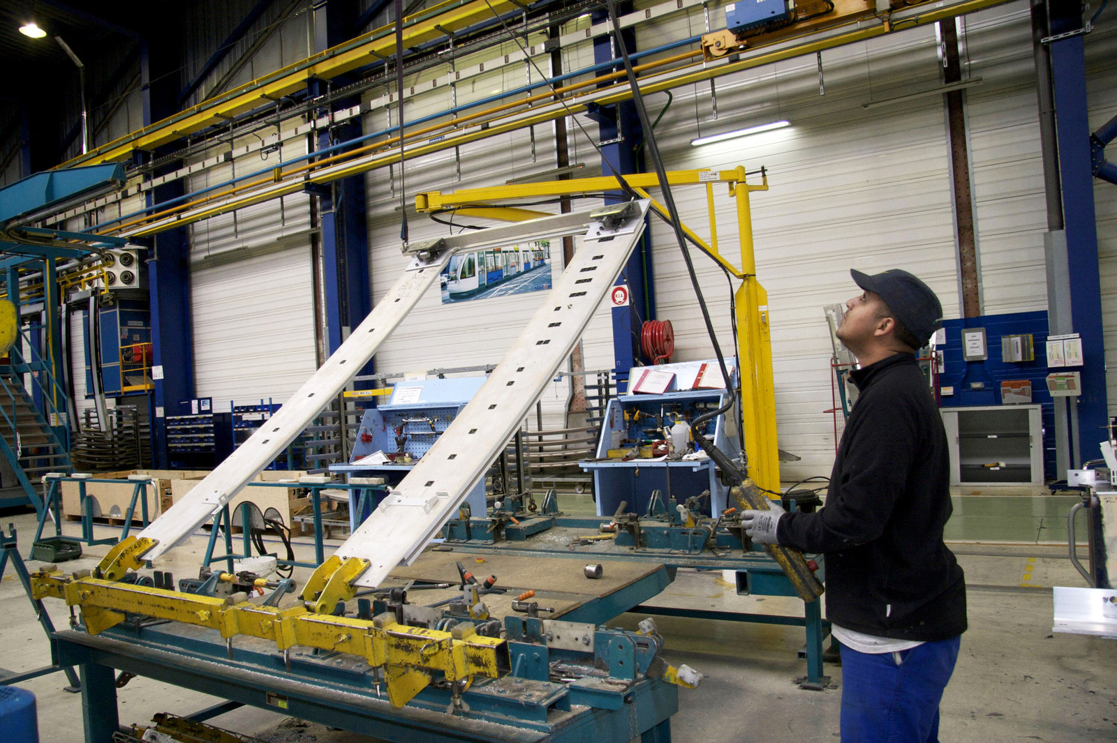 | Description | A skilled worker operates machinery to lift a sliding door to be installed on a tram, Alstom factory, La Rochelle, Charente Maritime, France |