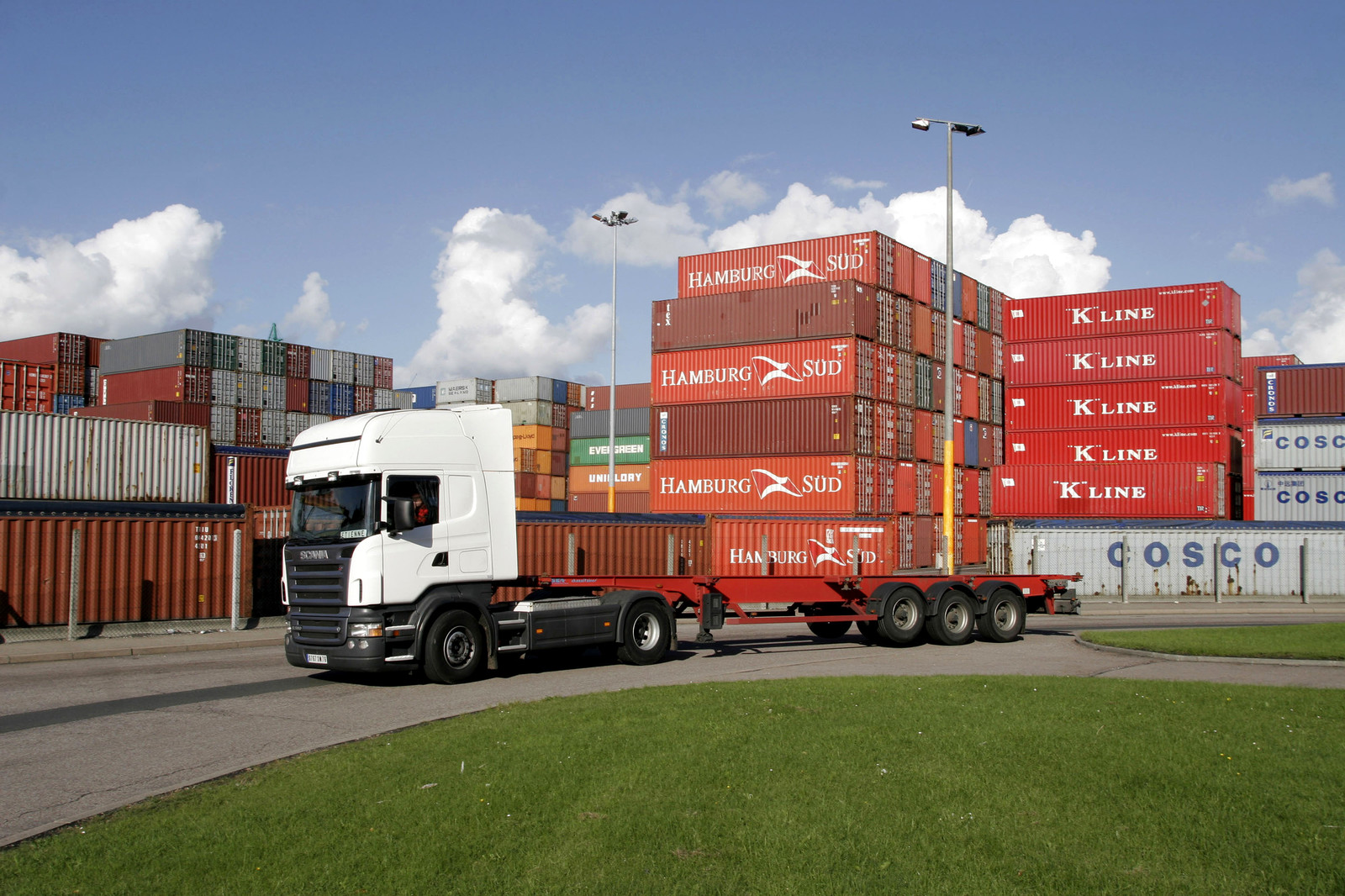 | Description | Container truck passing in front of stacked containers, the Port of Le Havre, Seine Maritime, France |
