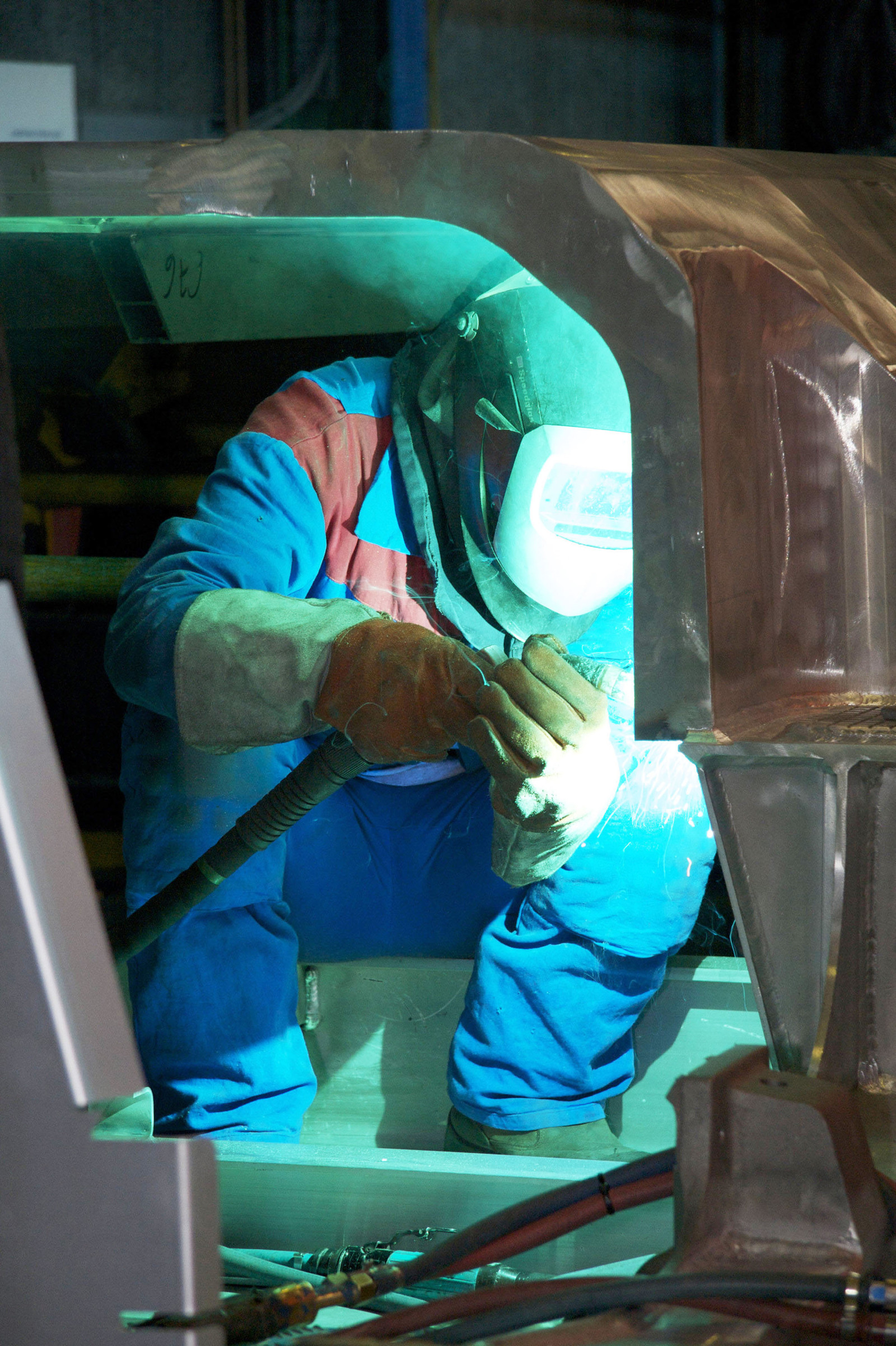 | Description | A skilled worker solders the chassis of a two floor TGV train, Alstom factory, La Rochelle, Charente Maritime, France |