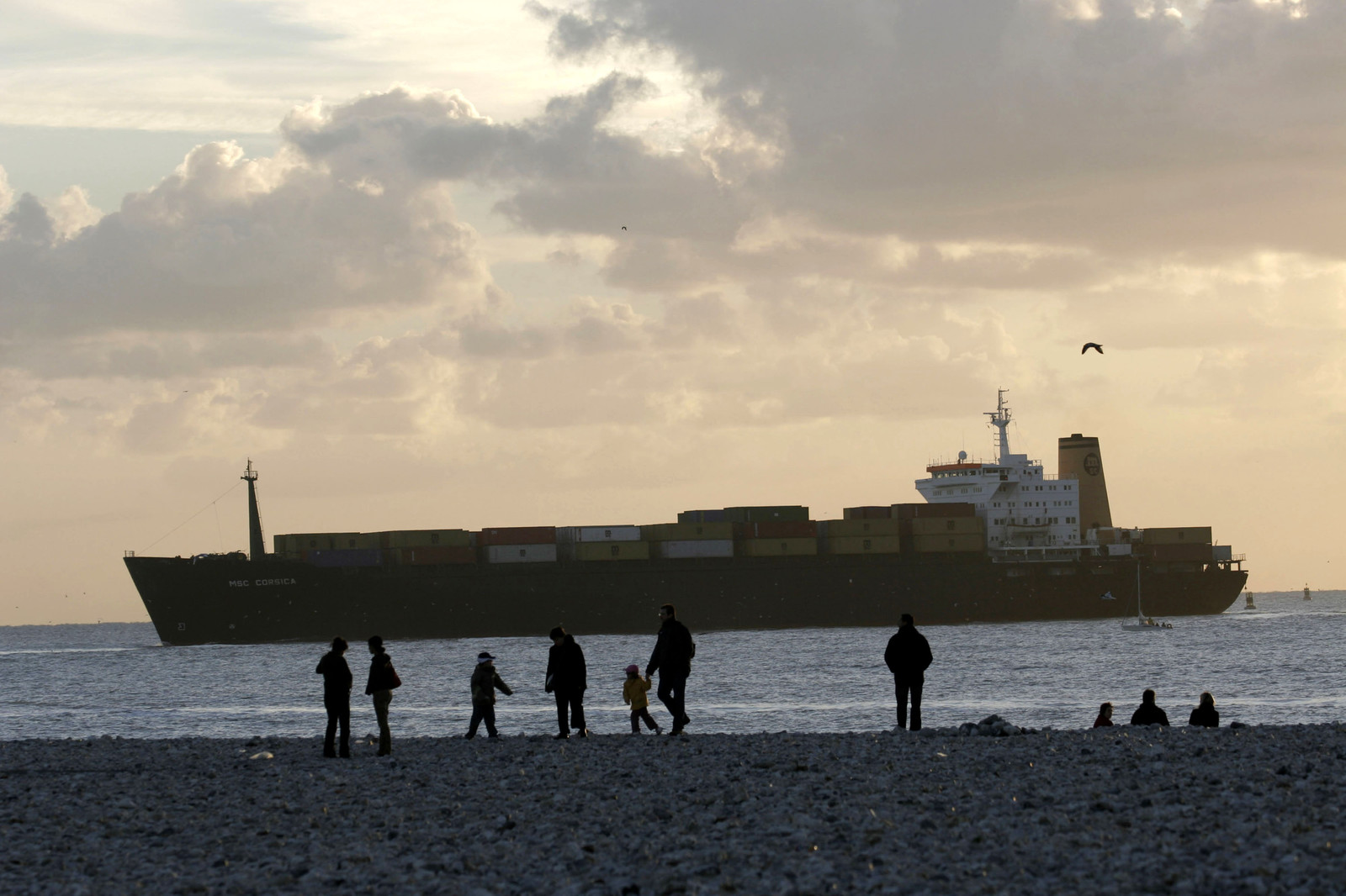 Container ship entering the Port of Le Havre, Seine Maritime, France