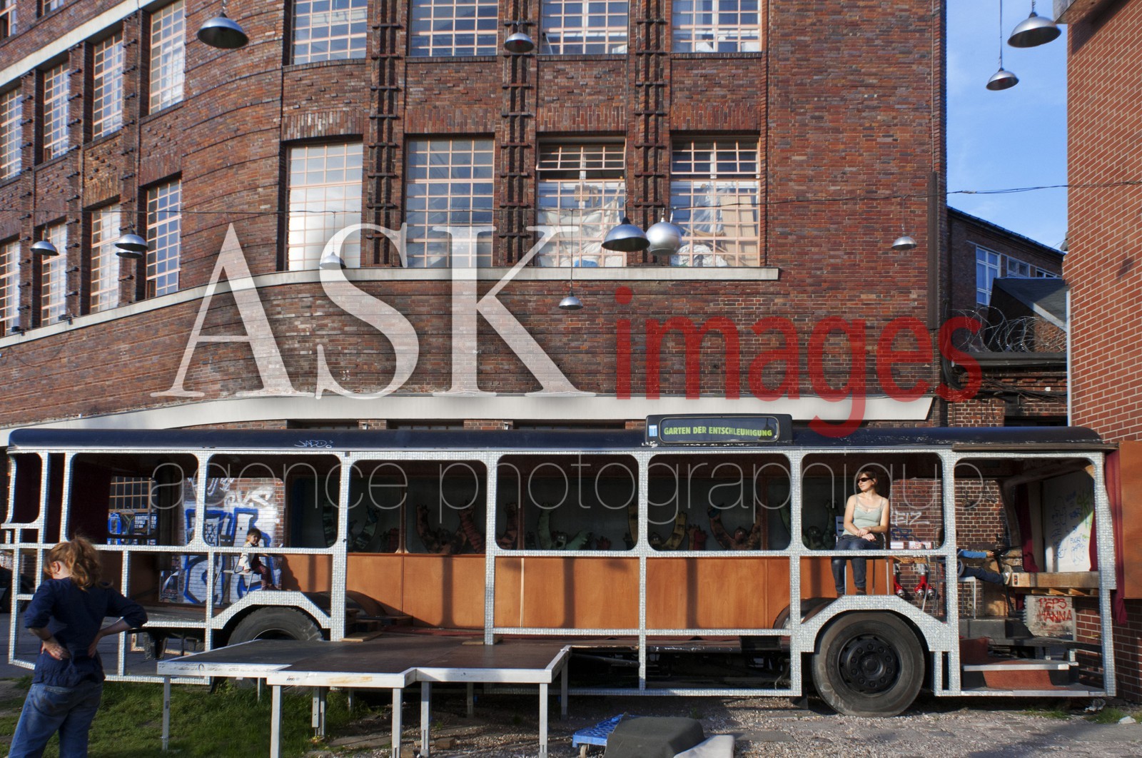 | Description | Berlin, Germany, on a old bus in Arena Berlin. Oversized benches and cars covered in grass at Arena Berlin. Cultural events in a listed factory building along the former GDR border. Today, this 7,000 sqm venue at the edge of the Spree River is the site for countless concerts, fairs and parties |