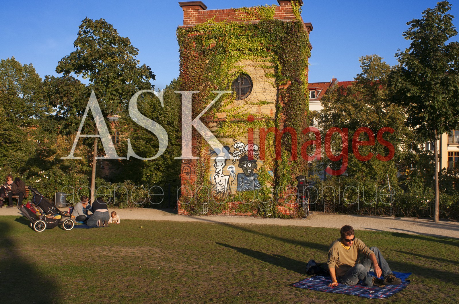 | Description | Prenzlauerberg District, garden around the former Wasserturm, 1873 brick water tower converted to an apartment. Wasserturm. Watertower in Berlin (Germany) was build up in 1877 and is the symbol for Prenzlauer Berg. |