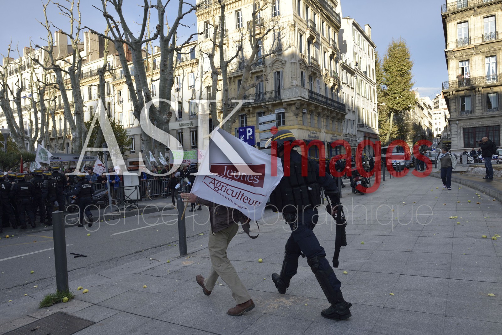 | Description | Marseille, Manifestation des Agriculteurs, Riziculteurs, Eleveurs ... à Marseille le mercredi 5 Novembre 2014 sur le vieux port et devant la préfecture. Un jeune Agriculteur tente de franchir le barrage de C R S pour atteindre la Préfecture, et se fait refoulé. |