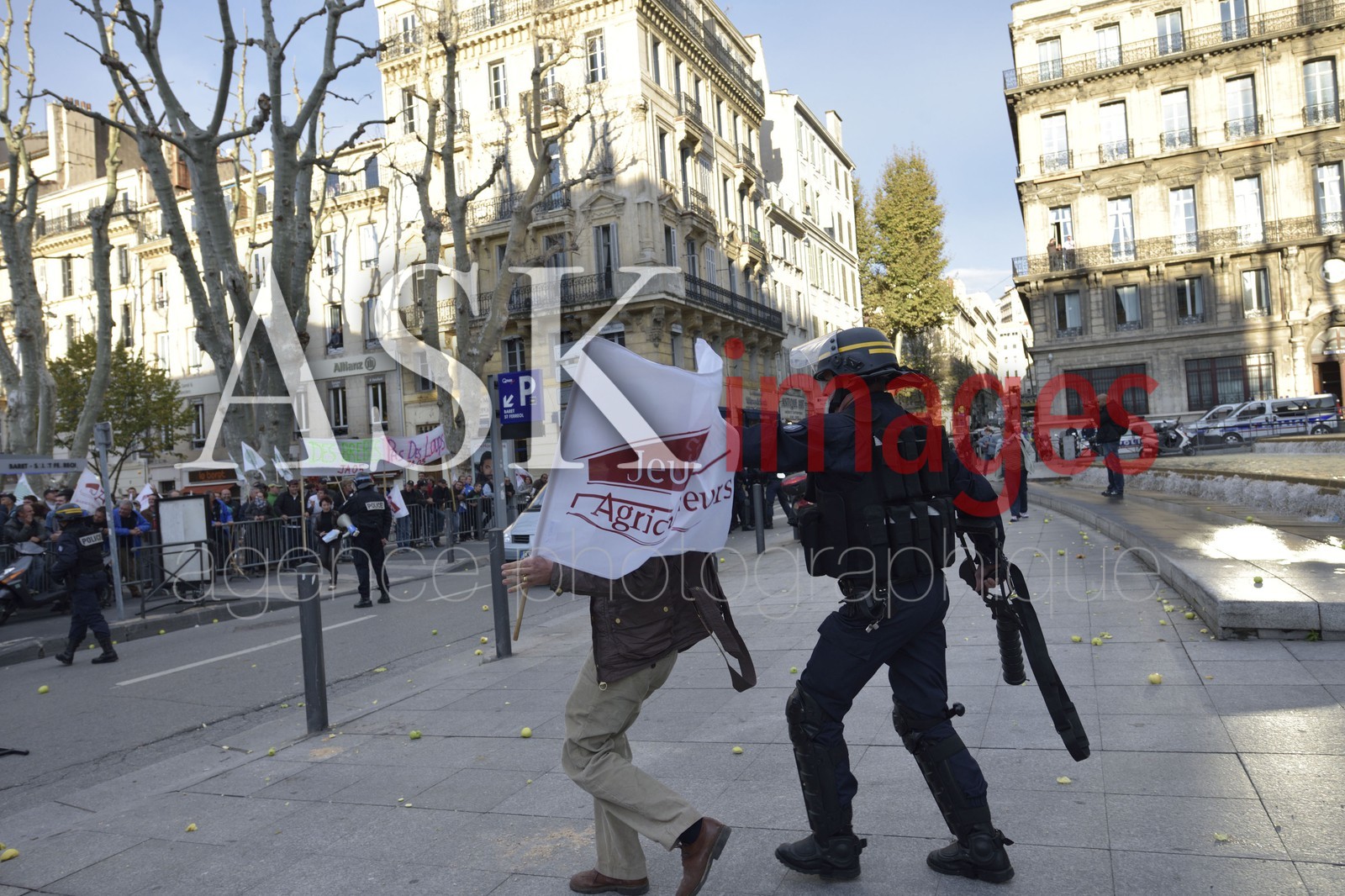 | Description | Marseille, Manifestation des Agriculteurs, Riziculteurs, Eleveurs ... à Marseille le mercredi 5 Novembre 2014 sur le vieux port et devant la préfecture. Un jeune Agriculteur tente de franchir le barrage de C R S pour atteindre la Préfecture, et se fait refoulé. |