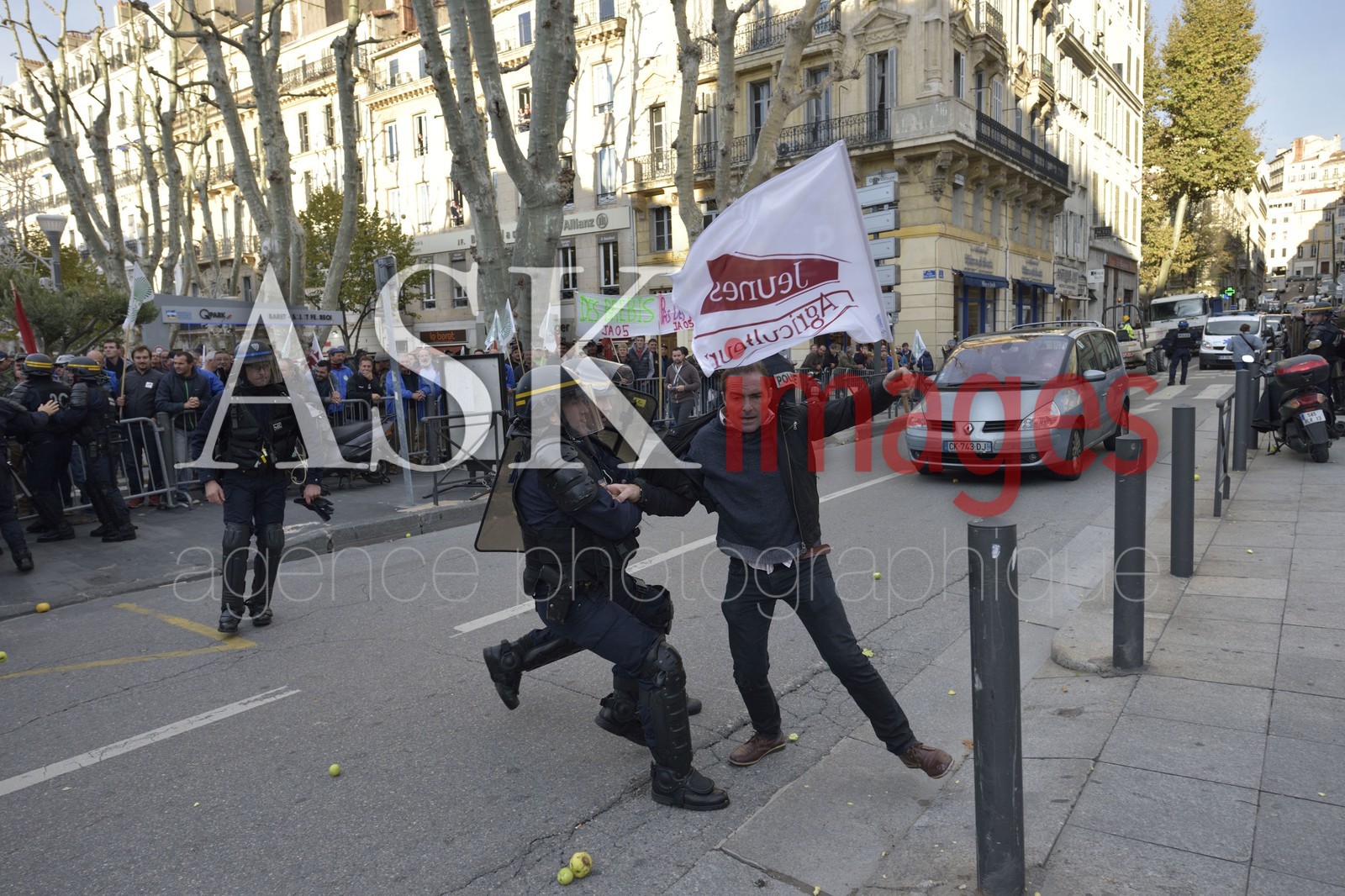 | Description | Marseille, Manifestation des Agriculteurs, Riziculteurs, Eleveurs ... à Marseille le mercredi 5 Novembre 2014 sur le vieux port et devant la préfecture. Un jeune Agriculteur tente de franchir le barrage de C R S pour atteindre la Préfecture, et se fait refoulé. |