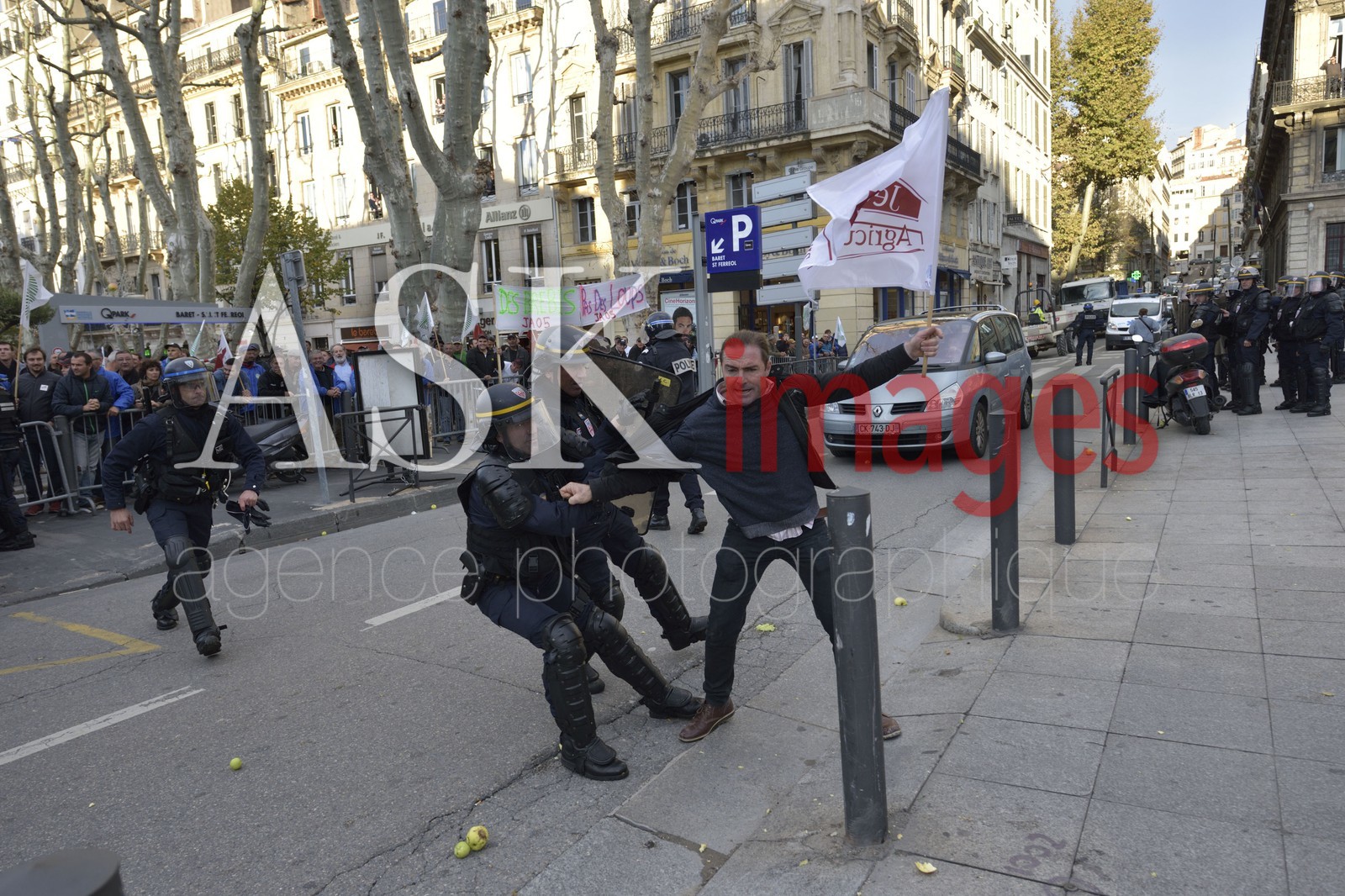 | Description | Marseille, Manifestation des Agriculteurs, Riziculteurs, Eleveurs ... à Marseille le mercredi 5 Novembre 2014 sur le vieux port et devant la préfecture. Un jeune Agriculteur tente de franchir le barrage de C R S pour atteindre la Préfecture, et se fait refoulé. |