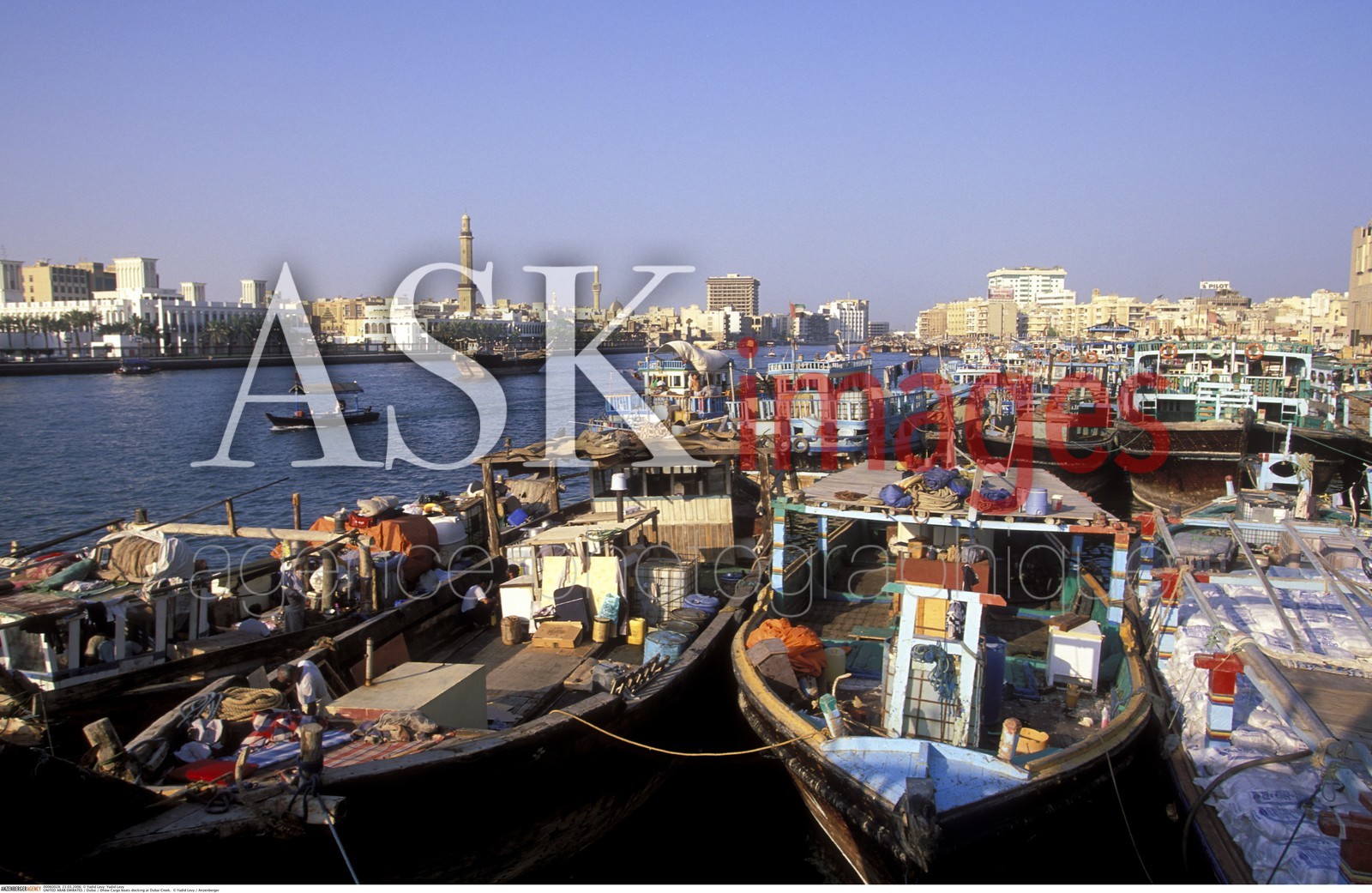 UNITED ARAB EMIRATES, Dubai, Dhow Cargo boats docking at Dubai Creek.