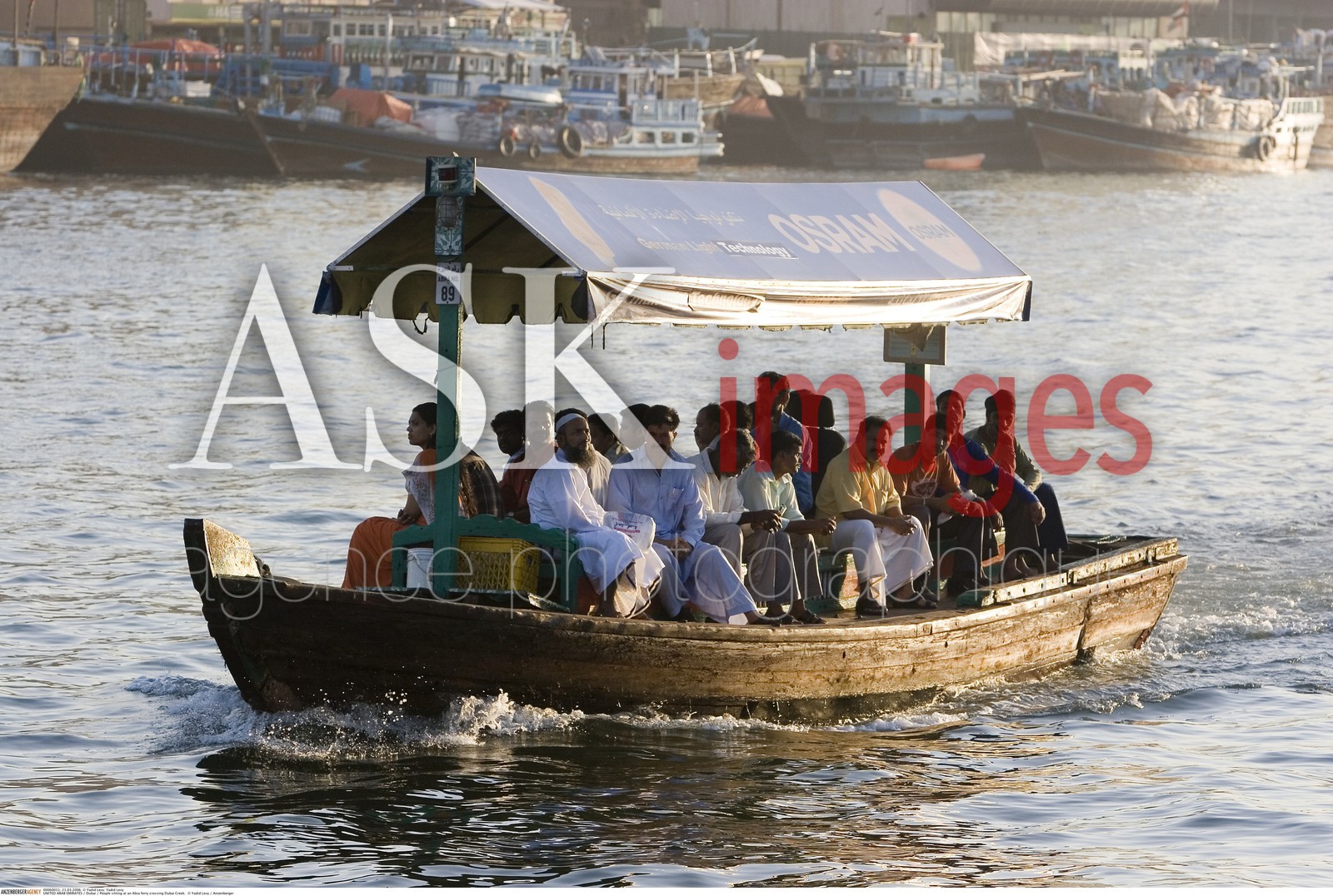 UNITED ARAB EMIRATES, Dubai, People sitting at an Abra ferry crossing Dubai Creek.