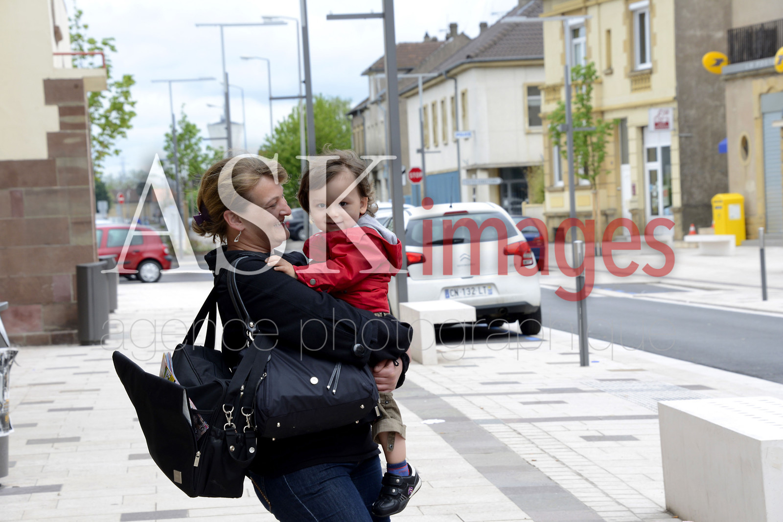 Moselle. Hagondange. Mere et enfant dans la rue.