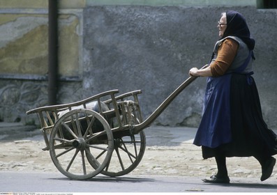 ROMANIA, Apoldu de Sus (germ.: Groflpold), 'Landler' woman brings gas tank to refill.