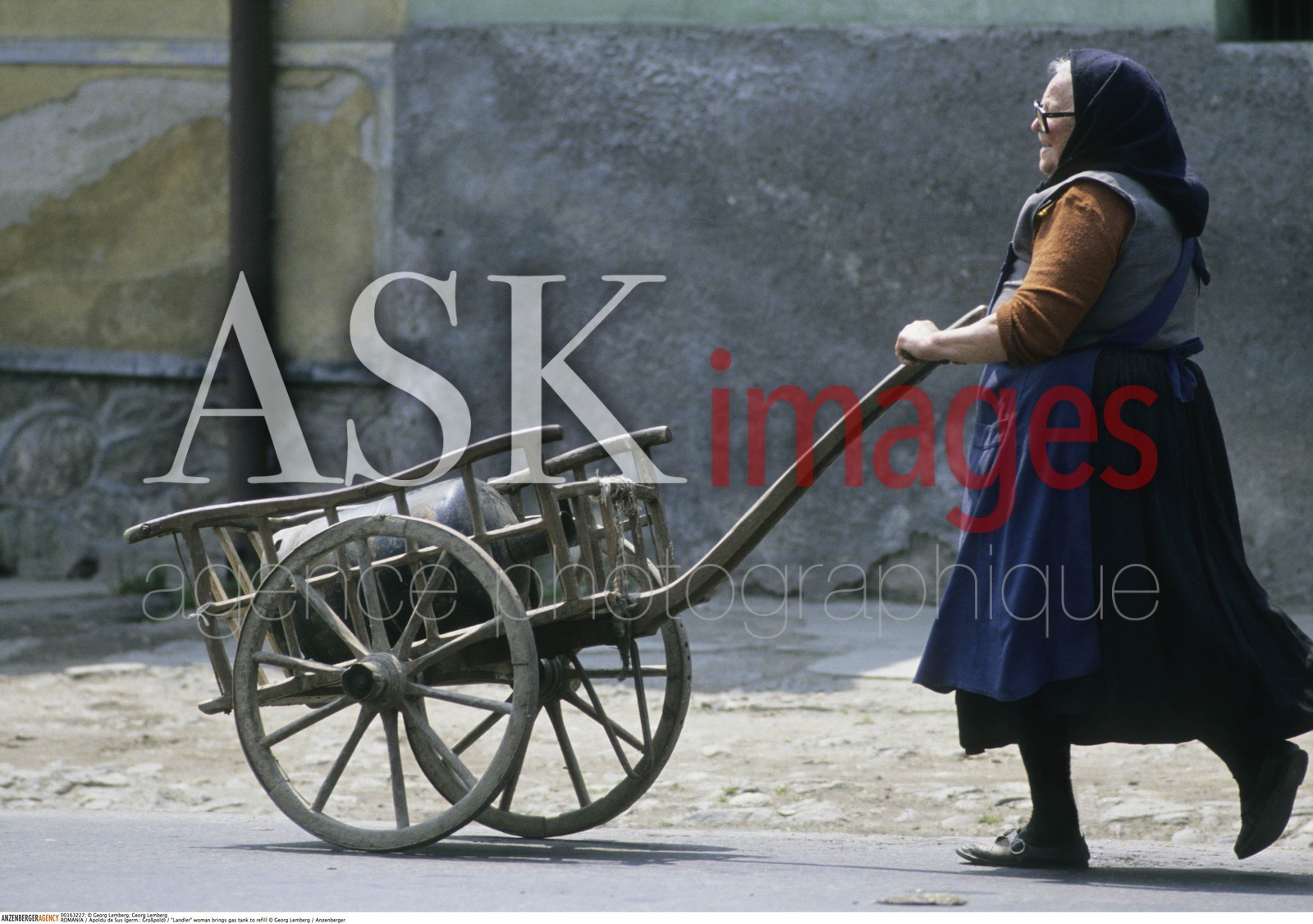 | Description | ROMANIA, Apoldu de Sus (germ.: Groflpold), 'Landler' woman brings gas tank to refill. |