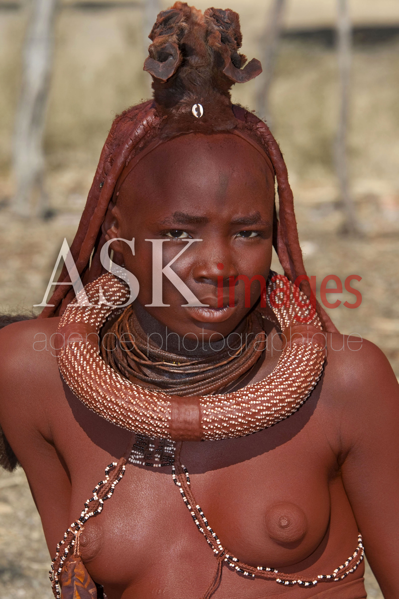 DescriptionLES HIMBA sont un peuple de pasteurs nomades de Namibie. Ils se parent volontiers de colliers en cuir et d'anneaux en laiton et enduisent leur peau d'une pate a base de beurre et de bois rouge . Les jeunes filles portent deux nattes epaisses, tressees vers l'avant du visage et redressees au dessus du front telles des cornes *** THE HIMBA are a nomadic people of Namibia. They adorn themselves with leather collars and brass rings and coat their skin with a paste made of butter and red wood. Girls wear two thick plaits, braided forward face and straightened above the forehead like horns, Namibia.