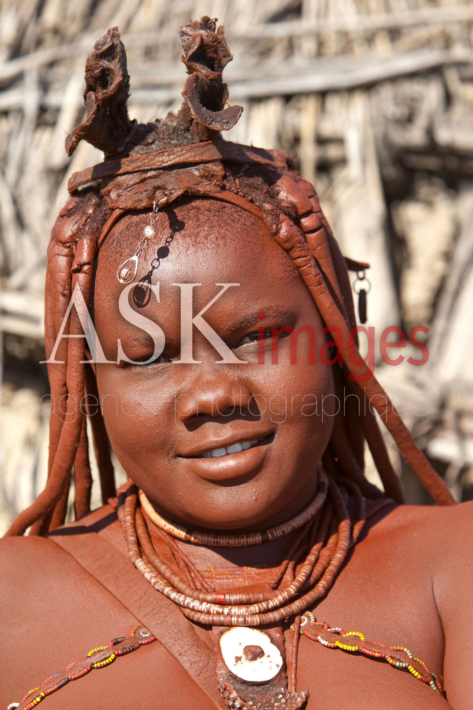 DescriptionLES HIMBA sont un peuple de pasteurs nomades de Namibie. Ils se parent volontiers de colliers en cuir et d'anneaux en laiton et enduisent leur peau d'une pate a base de beurre et de bois rouge . Les jeunes filles portent deux nattes epaisses, tressees vers l'avant du visage et redressees au dessus du front telles des cornes *** THE HIMBA are a nomadic people of Namibia. They adorn themselves with leather collars and brass rings and coat their skin with a paste made of butter and red wood. Girls wear two thick plaits, braided forward face and straightened above the forehead like horns, Namibia.