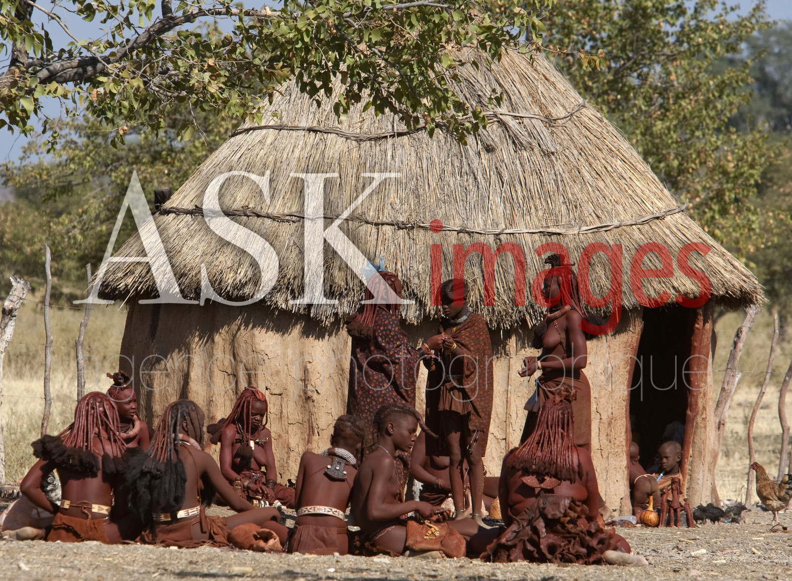 DescriptionLES HIMBA sont un peuple de pasteurs nomades de Namibie. Ils se parent volontiers de colliers en cuir et d'anneaux en laiton et enduisent leur peau d'une pate a base de beurre et de bois rouge. les cases appellees ''pontok'' sont faites de branches et branchages recouverts d'un melange d'argile et de bouse sechee *** THE HIMBA are a nomadic people of Namibia. They adorn themselves with leather collars and brass rings and coat their skin with a paste made of butter and red wood, Namibia. The huts are called "pontok" and are made ​​with tree branches covered with mixted with clay and dung