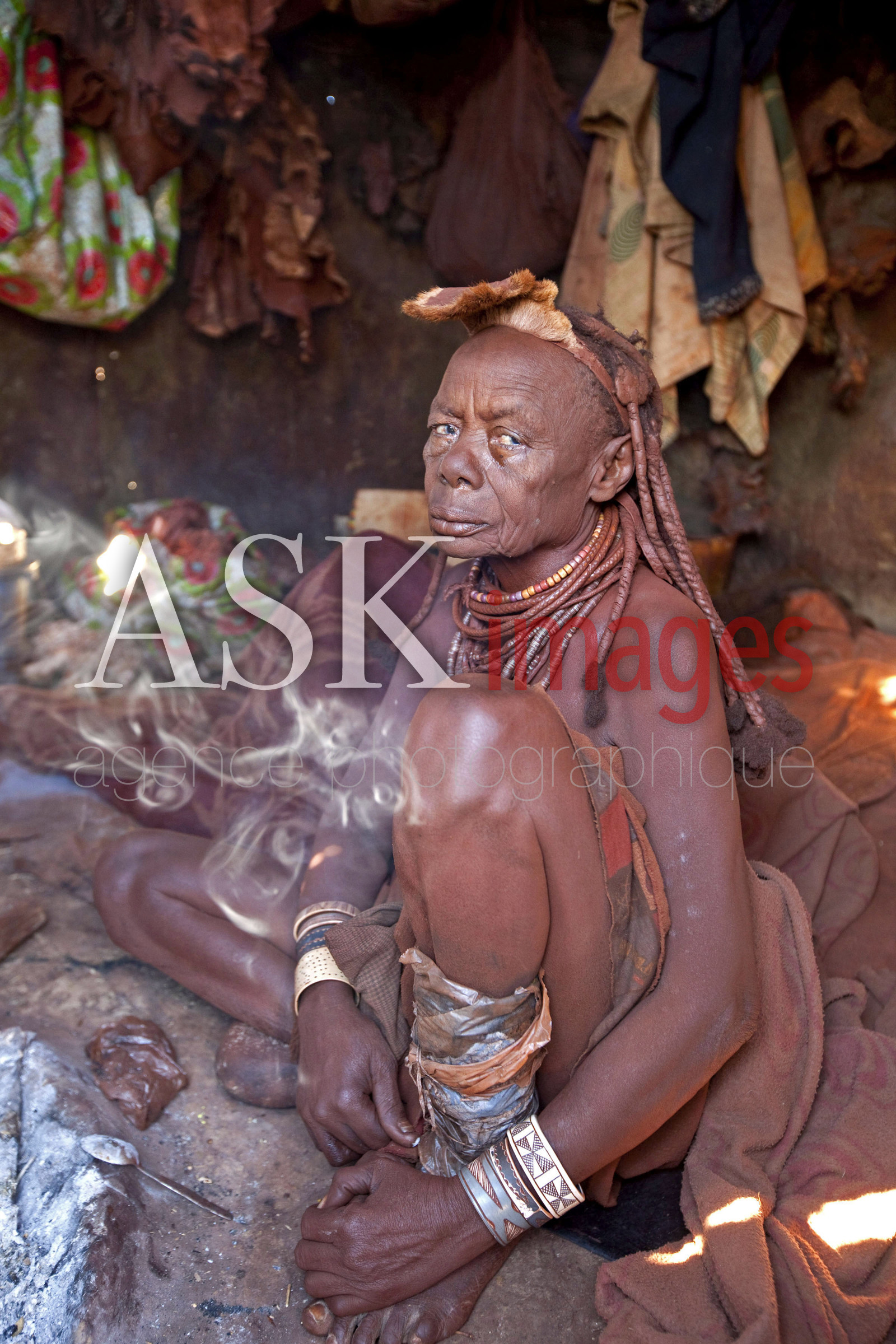 DescriptionLES HIMBA sont un peuple de pasteurs nomades de Namibie. Ils se parent volontiers de colliers en cuir et d'anneaux en laiton et enduisent leur peau d'une pate a base de beurre et de bois rouge. les cases appellees ''pontok'' sont faites de branches et branchages recouverts d'un melange d'argile et de bouse sechee. L'interieur d'une case *** THE HIMBA are a nomadic people of Namibia. They adorn themselves with leather collars and brass rings and coat their skin with a paste made of butter and red wood. The huts are called "pontok" and are made with tree branches covered with mixted with clay and dung. Iinterior of a hut, Namibia.