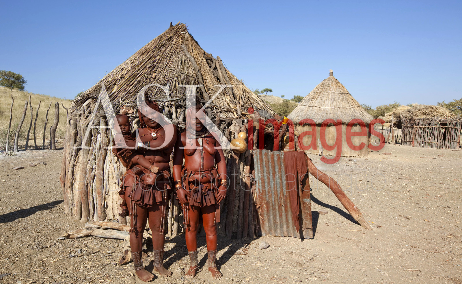 DescriptionLES HIMBA sont un peuple de pasteurs nomades de Namibie. Ils se parent volontiers de colliers en cuir et d'anneaux en laiton et enduisent leur peau d'une pate a base de beurre et de bois rouge. les cases appellees ''pontok'' sont faites de branches et branchages recouverts d'un melange d'argile et de bouse sechee *** THE HIMBA are a nomadic people of Namibia. They adorn themselves with leather collars and brass rings and coat their skin with a paste made of butter and red wood, Namibia. The huts are called "pontok" and are made ​​with tree branches covered with mixted with clay and dung