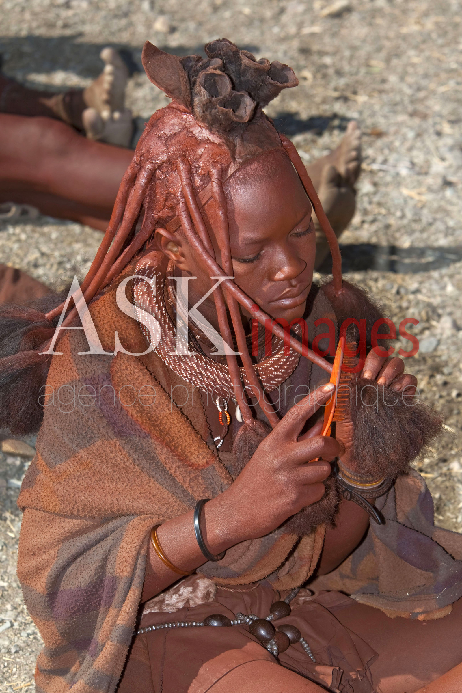 DescriptionLES HIMBA sont un peuple de pasteurs nomades de Namibie. Ils se parent volontiers de colliers en cuir et d'anneaux en laiton et enduisent leur peau d'une pate a base de beurre et de bois rouge . Les jeunes filles portent deux nattes epaisses, tressees vers l'avant du visage et redressees au dessus du front telles des cornes *** THE HIMBA are a nomadic people of Namibia. They adorn themselves with leather collars and brass rings and coat their skin with a paste made of butter and red wood. Girls wear two thick plaits, braided forward face and straightened above the forehead like horns, Namibia.