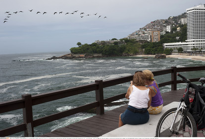 • BRAZIL / Rio de Janeiro / 17.01.2016..Two women take a break at one of the panoramic viewpoints on the new bicycle lane Tim Maia along the Avenida Niemeyer, on the day it was inaugurated by Rio de Janeiro mayor Eduardo Paes. The new bicycle lane Tim Maia, which links Leblon and S„o Conrado neighbourhoods and run along the Atlantic coastline, is one of the infrastructural projects of the Olympic games RIO2016...© Lara Ciarabellini / Anzenberger