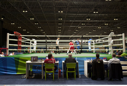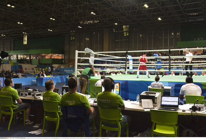 • BRAZIL / Rio de Janeiro / ..The International Box Tournament as a test event in pavilion 4 in RioCentro, one of the installations for the Olympic Games of 2016 in Rio de Janeiro..Game between Hasanboy Dusmatov (Uzbekistan) and Patrick Chagas Valerio Lourenco (Brazil)...© Lara Ciarabellini / Anzenberger