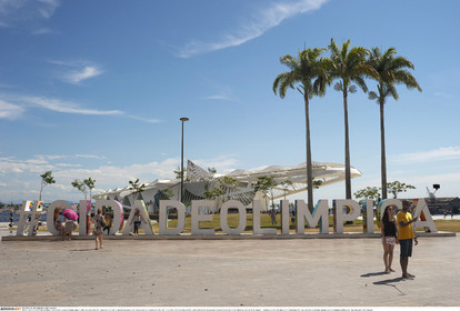 • BRAZIL / Rio de Janeiro / ..Mau· Square, located in the business district called Centro, has been closed for four years due to the re-qualification works and it was reopened in September 2015. .The 15 concrete letters and symbol of the hashtag #CidadeOlimpica were decorated by 15 artist, in 15 different places of Rio de Janeiro..The Museu do Amanh„ (Museum of Tomorrow) in the back was designed by the spanish architect Santiago Calatrava...© Lara Ciarabellini / Anzenberger