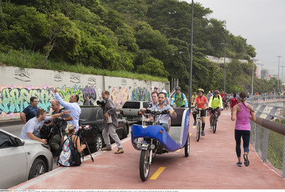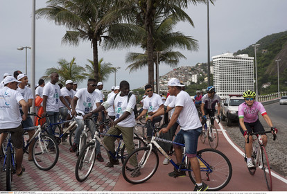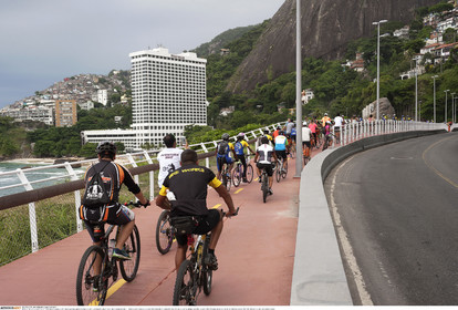 • BRAZIL / Rio de Janeiro / 17.01.2016.Bikers cycling on the day it was inaugurated by Rio de Janeiro mayor Eduardo Paes. The new bicycle lane Tim Maia, which links Leblon and S„o Conrado neighbourhoods and run along the Atlantic coastline, is one of the infrastructural projects of the Olympic games RIO2016...© Lara Ciarabellini / Anzenberger