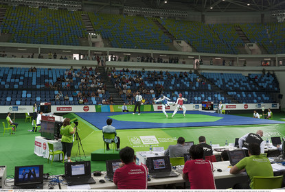 • BRAZIL / Rio de Janeiro / 21.02.2016 / Olympic Games 2016 Preparation / Dmitry Shokin (Uzbekistan) and Miguel Soares (Brazil) compete in the +80Kg category quarterfinals during the Aquece Rio Taekwondo Test Event at the Arena Carioca 1, in the Olympic Park in Barra de Tijuca, Rio de Janeiro. The test event counted as International Taekwondo Tournament (WTF). Dmitry Shokin, defeated the Brazilian athlete Soares and at the end won the gold medal +80Kg masculine category at the International Taekwondo Tournament (WTF)...© Lara Ciarabellini / Anzenberger
