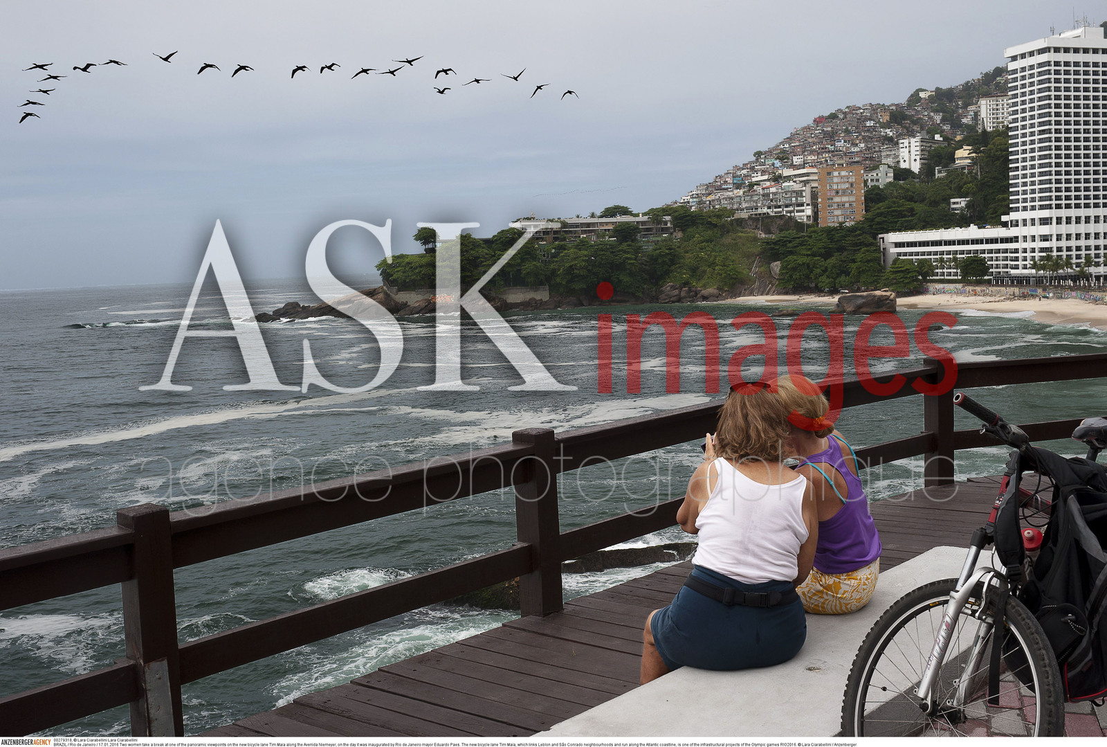 | Description | BRAZIL / Rio de Janeiro / 17.01.2016..Two women take a break at one of the panoramic viewpoints on the new bicycle lane Tim Maia along the Avenida Niemeyer, on the day it was inaugurated by Rio de Janeiro mayor Eduardo Paes. The new bicycle lane Tim Maia, which links Leblon and S„o Conrado neighbourhoods and run along the Atlantic coastline, is one of the infrastructural projects of the Olympic games RIO2016...© Lara Ciarabellini / Anzenberger |