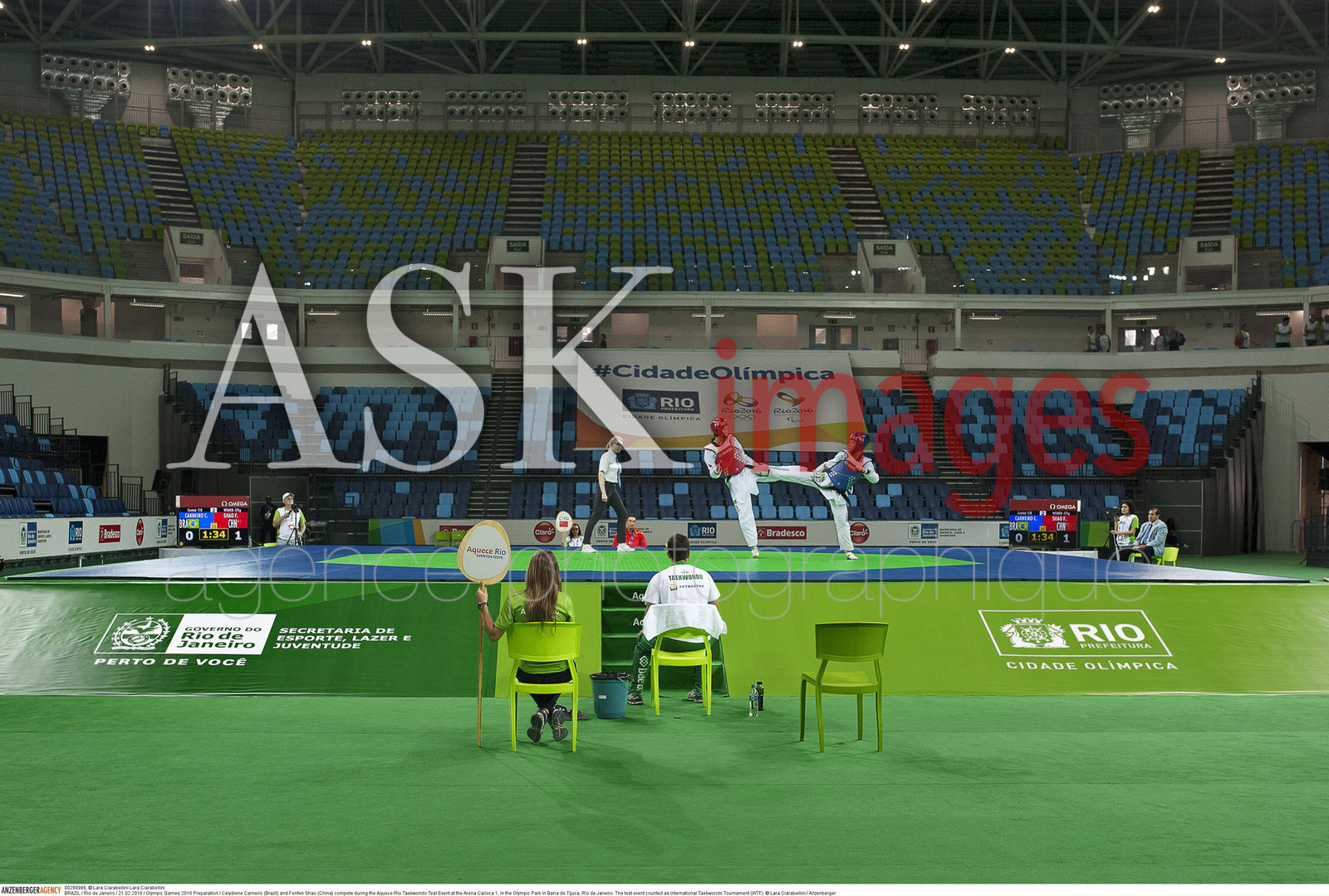 | Description | BRAZIL / Rio de Janeiro / 21.02.2016 / Olympic Games 2016 Preparation / Celydiene Carneiro (Brazil) and Fenfen Shao (China) compete during the Aquece Rio Taekwondo Test Event at the Arena Carioca 1, in the Olympic Park in Barra de Tijuca, Rio de Janeiro. The test event counted as International Taekwondo Tournament (WTF)...© Lara Ciarabellini / Anzenberger |