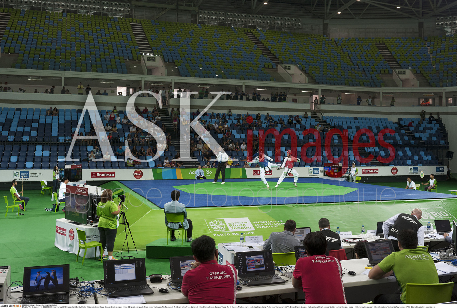 DescriptionBRAZIL / Rio de Janeiro / 21.02.2016 / Olympic Games 2016 Preparation / Dmitry Shokin (Uzbekistan) and Miguel Soares (Brazil) compete in the +80Kg category quarterfinals during the Aquece Rio Taekwondo Test Event at the Arena Carioca 1, in the Olympic Park in Barra de Tijuca, Rio de Janeiro. The test event counted as International Taekwondo Tournament (WTF). Dmitry Shokin, defeated the Brazilian athlete Soares and at the end won the gold medal +80Kg masculine category at the International Taekwondo Tournament (WTF)...© Lara Ciarabellini / Anzenberger