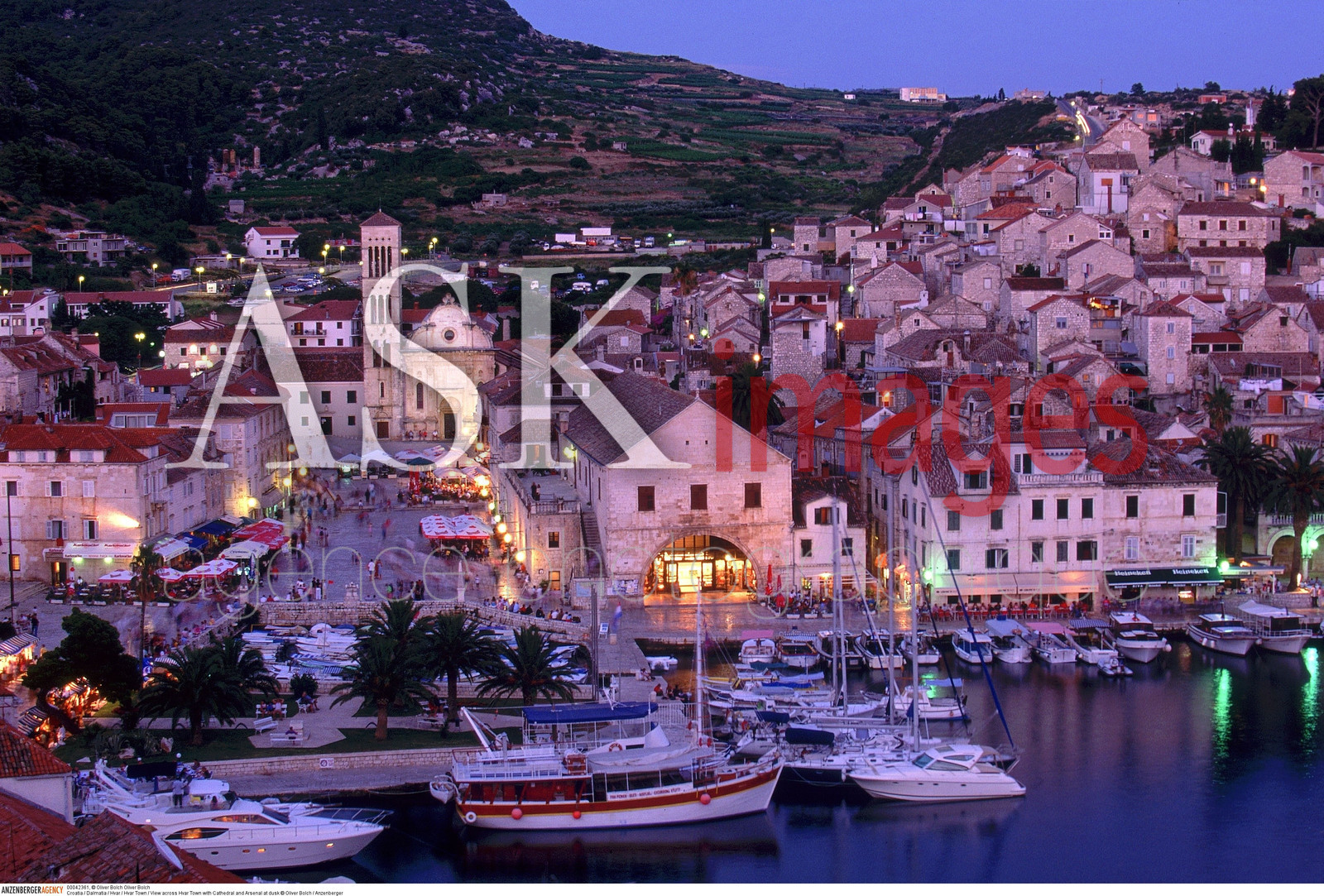 | Description | Croatia / Dalmatia / Hvar / Hvar Town / View across Hvar Town with Cathedral and Arsenal at dusk..© Oliver Bolch / Anzenberger |