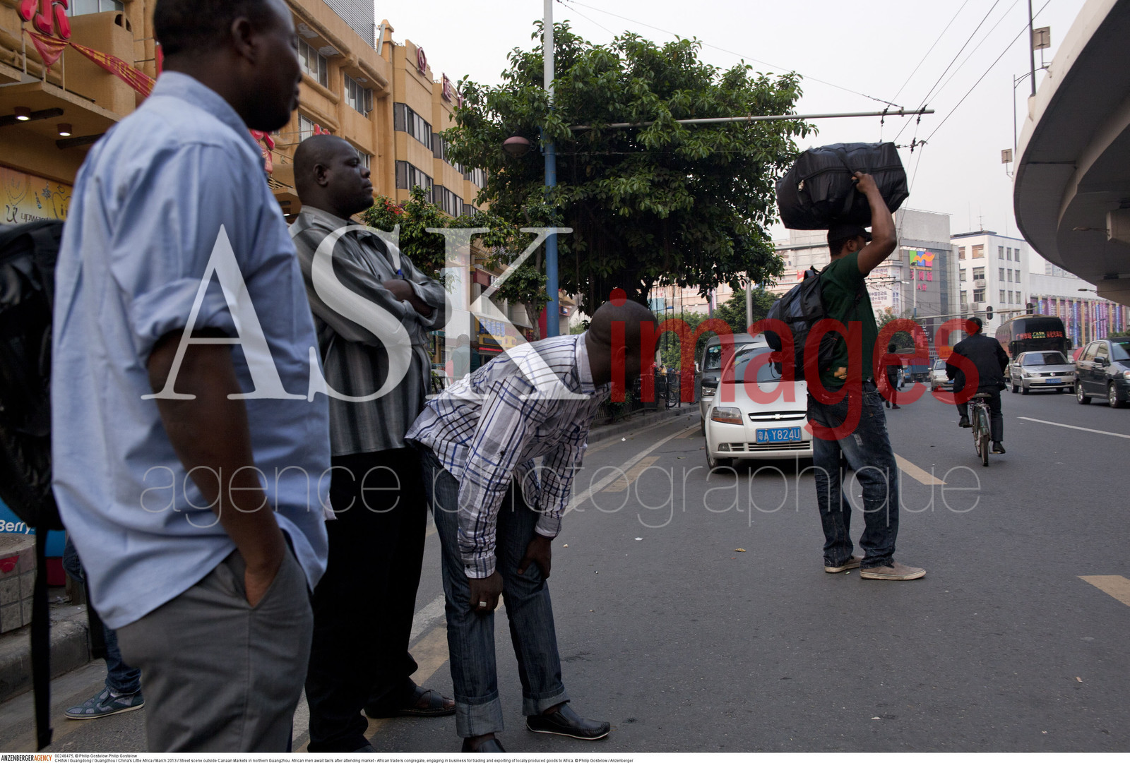 | Description | CHINA / Guangdong / Guangzhou / China's Little Africa / .Street scene outside Canaan Markets in northern Guangzhou. African men await taxi's after attending market - African traders congregate, engaging in business for trading and exporting of locally produced goods to Africa...© Philip Gostelow / Anzenberger |