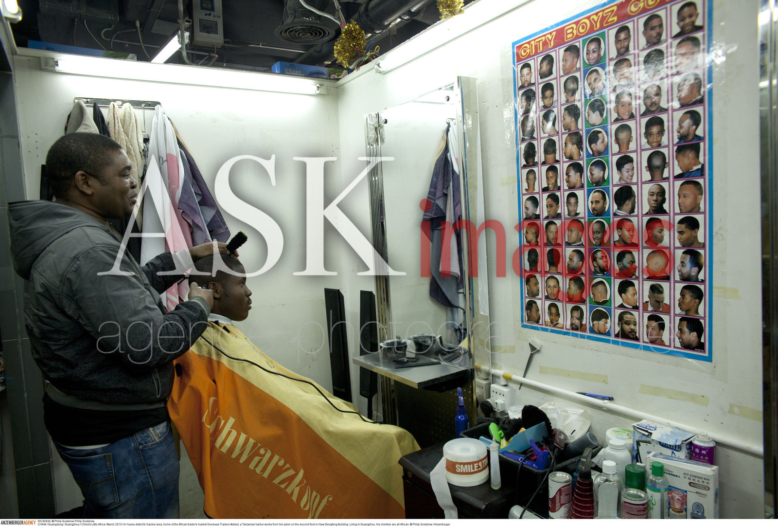 | Description | CHINA / Guangdong / Guangzhou / China's Little Africa / .In Yuexiu district's Xiaobei area, home of the African trader's market Overseas Traders Market, a Tanzanian barber works from his salon on the second floot or New Dengfeng Building. Living in Guangzhou, his clientele are all African. ..© Philip Gostelow / Anzenberger |