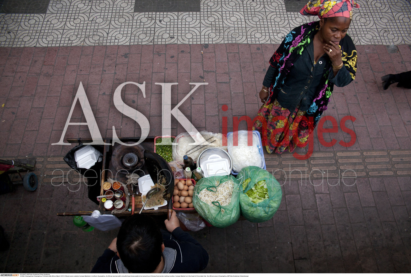 | Description | CHINA / Guangdong / Guangzhou / China's Little Africa / .Street scene outside Canaan Markets in northern Guangzhou. An African woman with colourful head dress waits to be served by a Chinese food vendor selling noodles. Canaan Market is in the heart of Chocolate City - the African area in Guangzhou...© Philip Gostelow / Anzenberger |